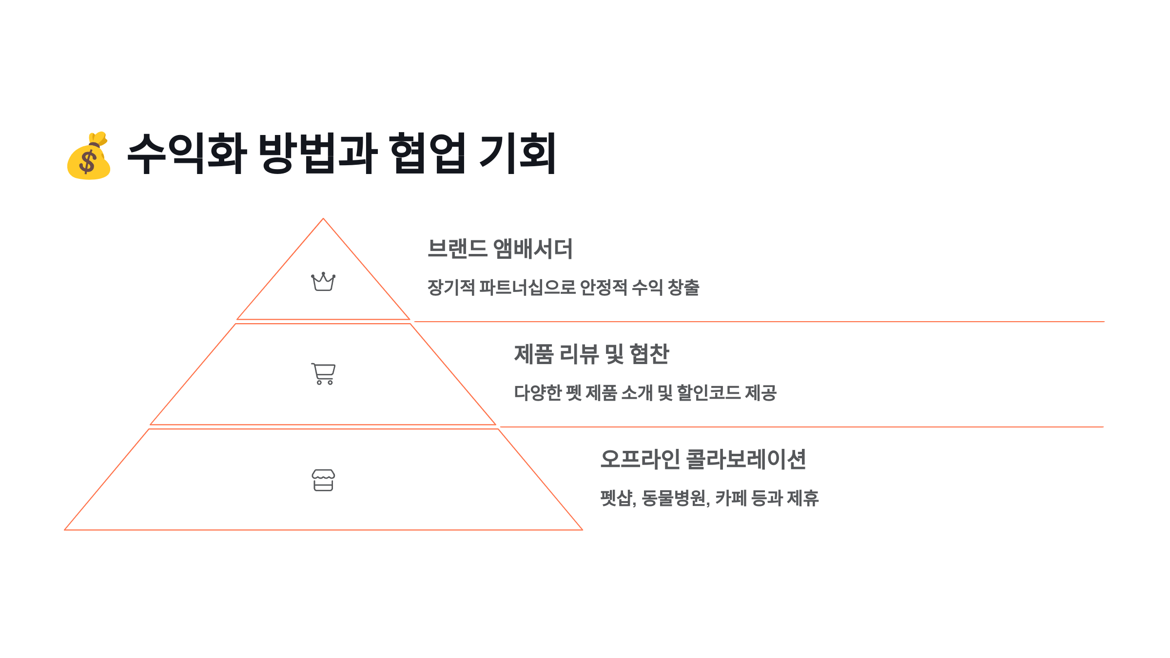 자체적인 상품 개발도 고려해볼 만한 수익화 방법이에요. 반려동물의 캐릭터를 활용한 굿즈나, 직접 경험해본 좋은 제품들을 큐레이션해서 판매하는 것도 가능해요. 요즘에는 개인도 쉽게 온라인 쇼핑몰을 운영할 수 있는 플랫폼들이 많아서 시작하기가 어렵지 않아요. 다만 이런 사업을 시작할 때는 사업자등록이나 세금 문제도 미리 알아보는 것이 좋아요.