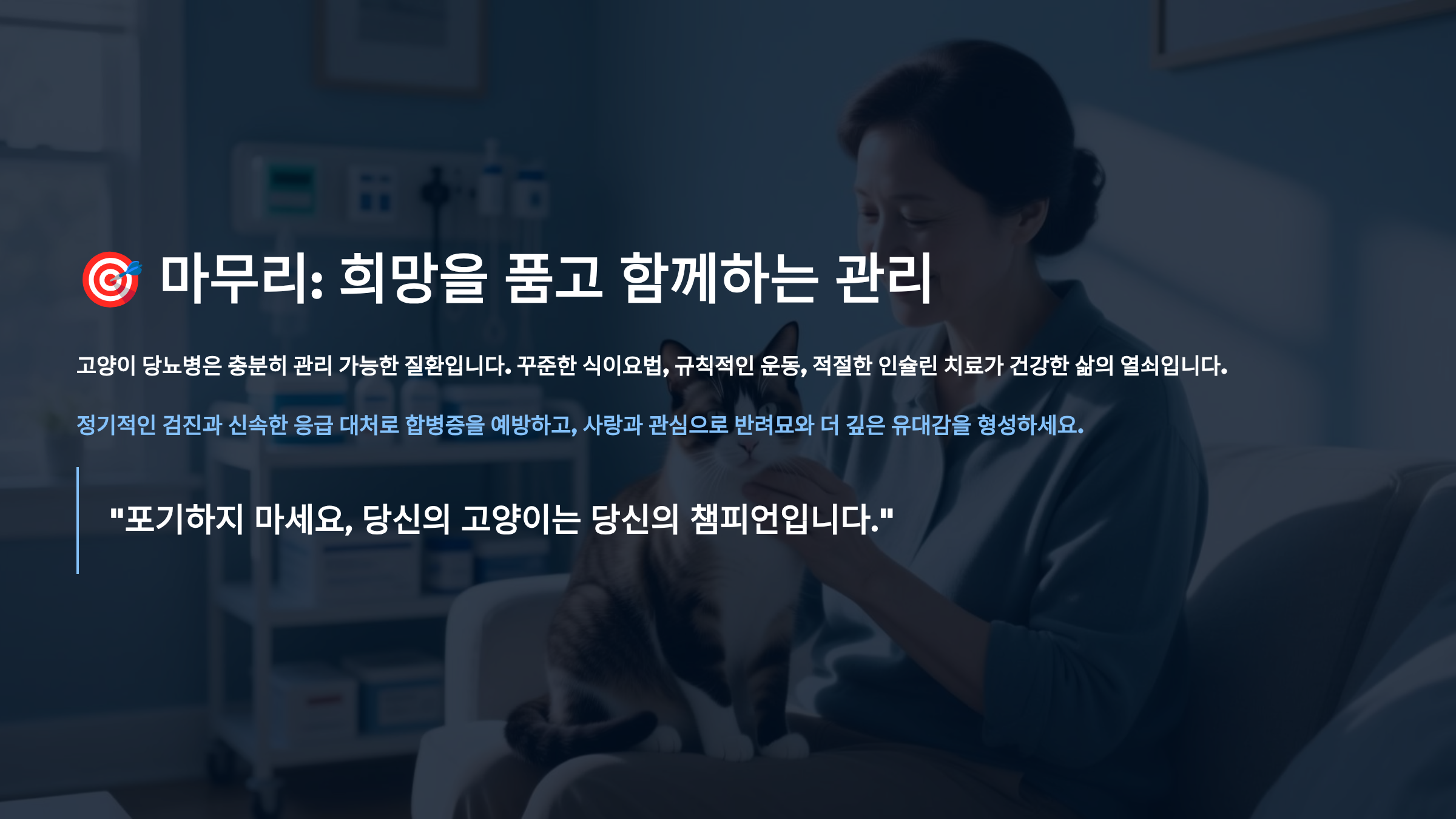 오늘 배운 내용을 하나씩 실천해보세요. 처방식 사료로 전환하고, 레이저 포인터로 놀아주고, 혈당을 체크하는 것부터 시작하세요. 작은 변화들이 모여 큰 결과를 만들어낼 거예요. 우리 고양이의 건강하고 행복한 미래, 여러분의 손에 달려 있어요! 화이팅! 🐱💪✨