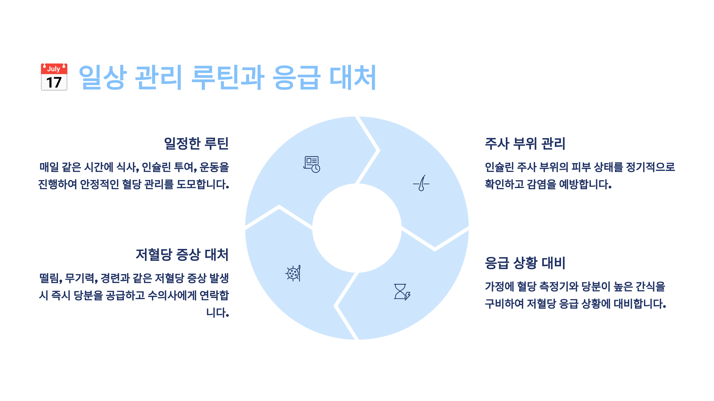 성공적인 당뇨병 관리의 비결은 일관된 일상 루틴이에요. 매일 같은 시간에 식사, 인슐린 주사, 운동을 하면 혈당이 안정되죠. 아침 7시 인슐린-식사, 오전 10시 놀이, 오후 7시 인슐린-식사, 저녁 9시 놀이 이런 식으로 스케줄을 짜보세요.