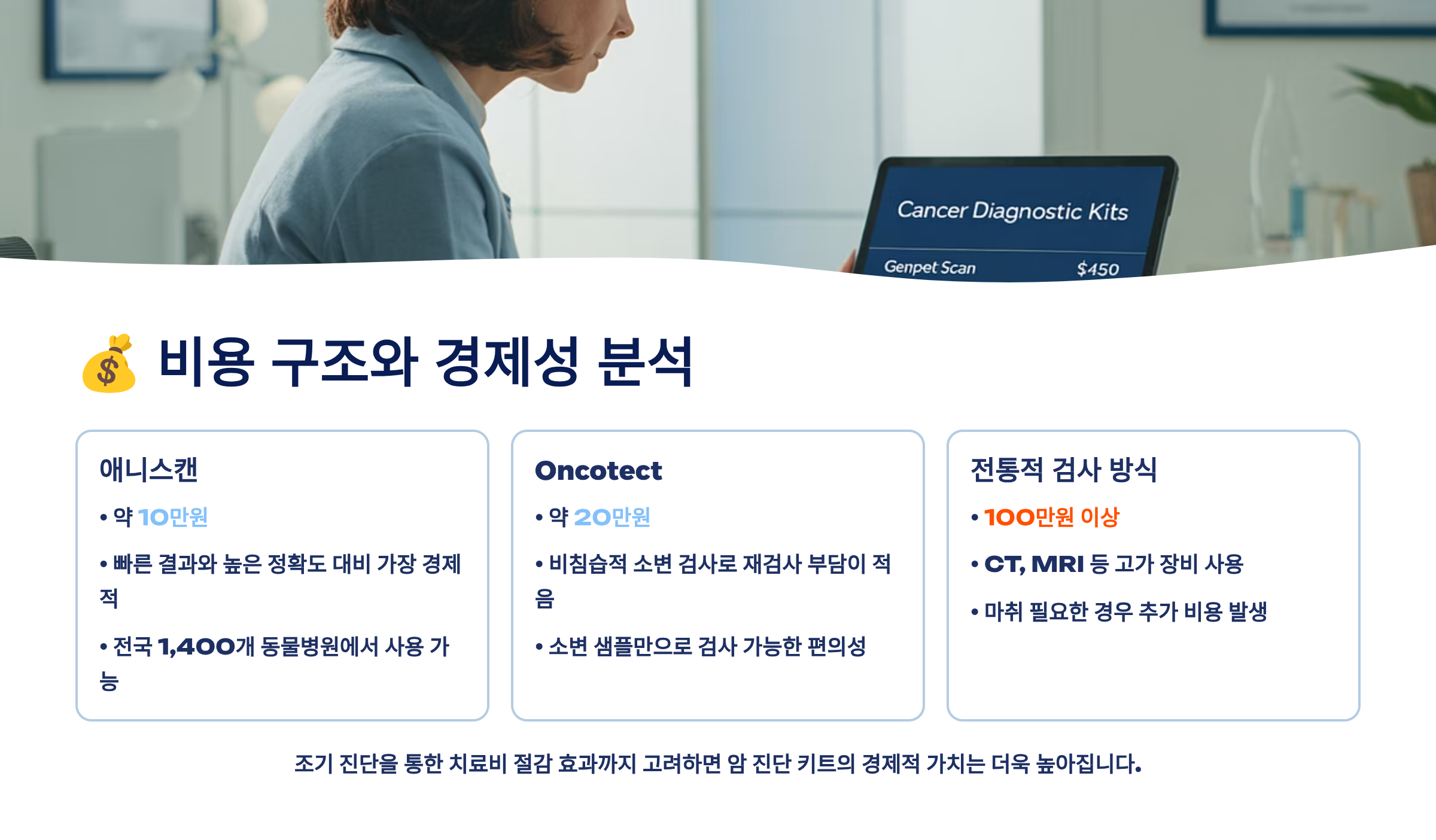 기존 동물병원에서 종합적인 암 검진을 받으면 평균 40만원 정도가 들어요. 여기에는 혈액검사, 엑스레이, 초음파 등이 포함되죠. CT나 MRI까지 찍으면 100만원을 훌쩍 넘어요. 게다가 정기적으로 검사해야 하니 경제적 부담이 만만치 않답니다.