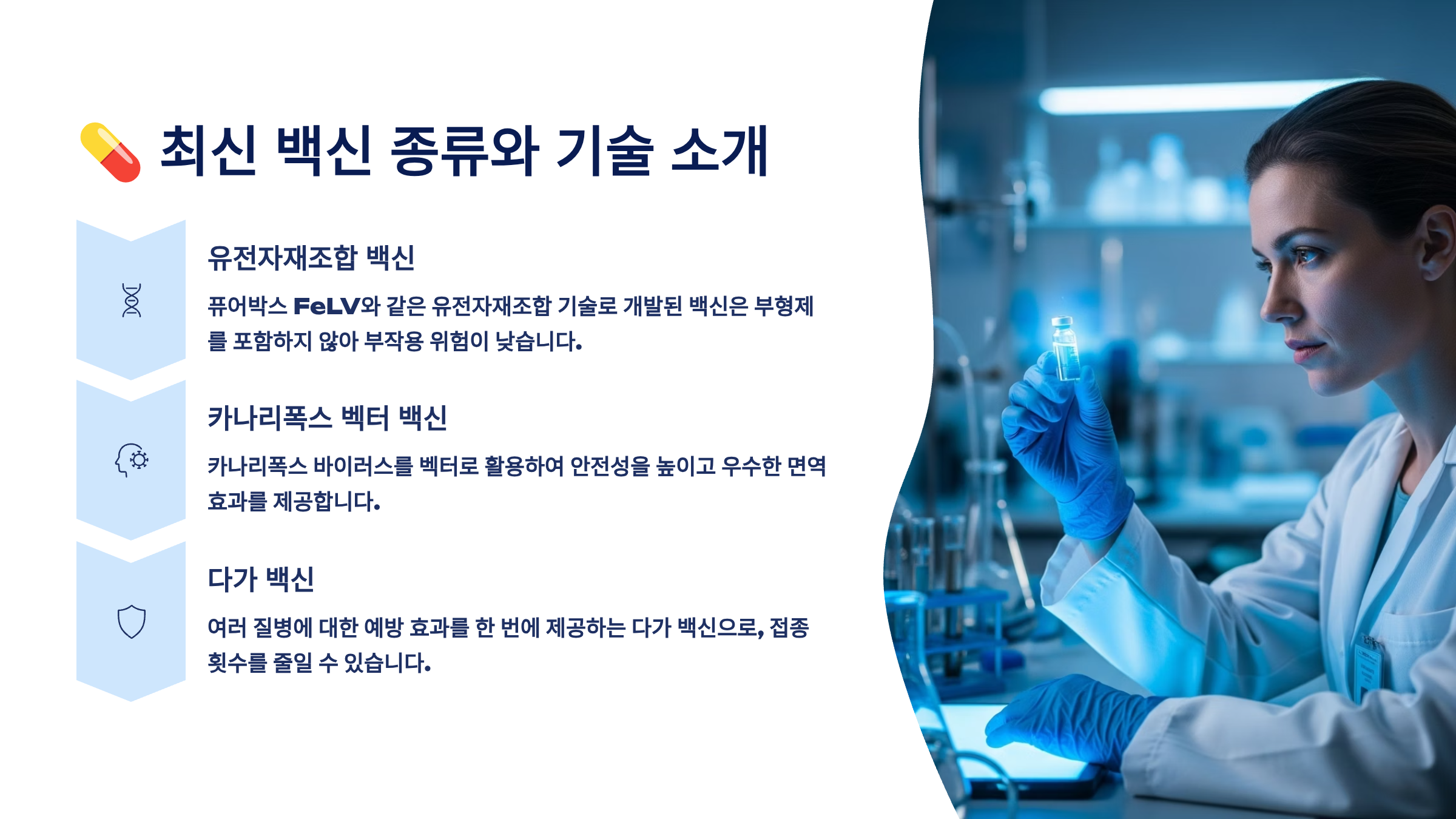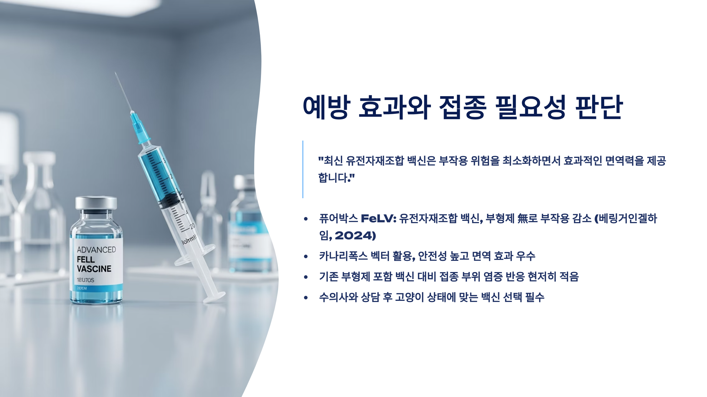 최신 백신 기술로 부작용이 크게 감소했어요. 특히 부형제(adjuvant)가 없는 백신이 개발되면서 접종 부위 염증이 현저히 줄었어요. 퓨어박스 FeLV 같은 유전자재조합 백신은 카나리폭스 벡터를 사용해 안전성을 높였고, 접종량도 0.5ml로 줄여 통증을 최소화했답니다. 🧬