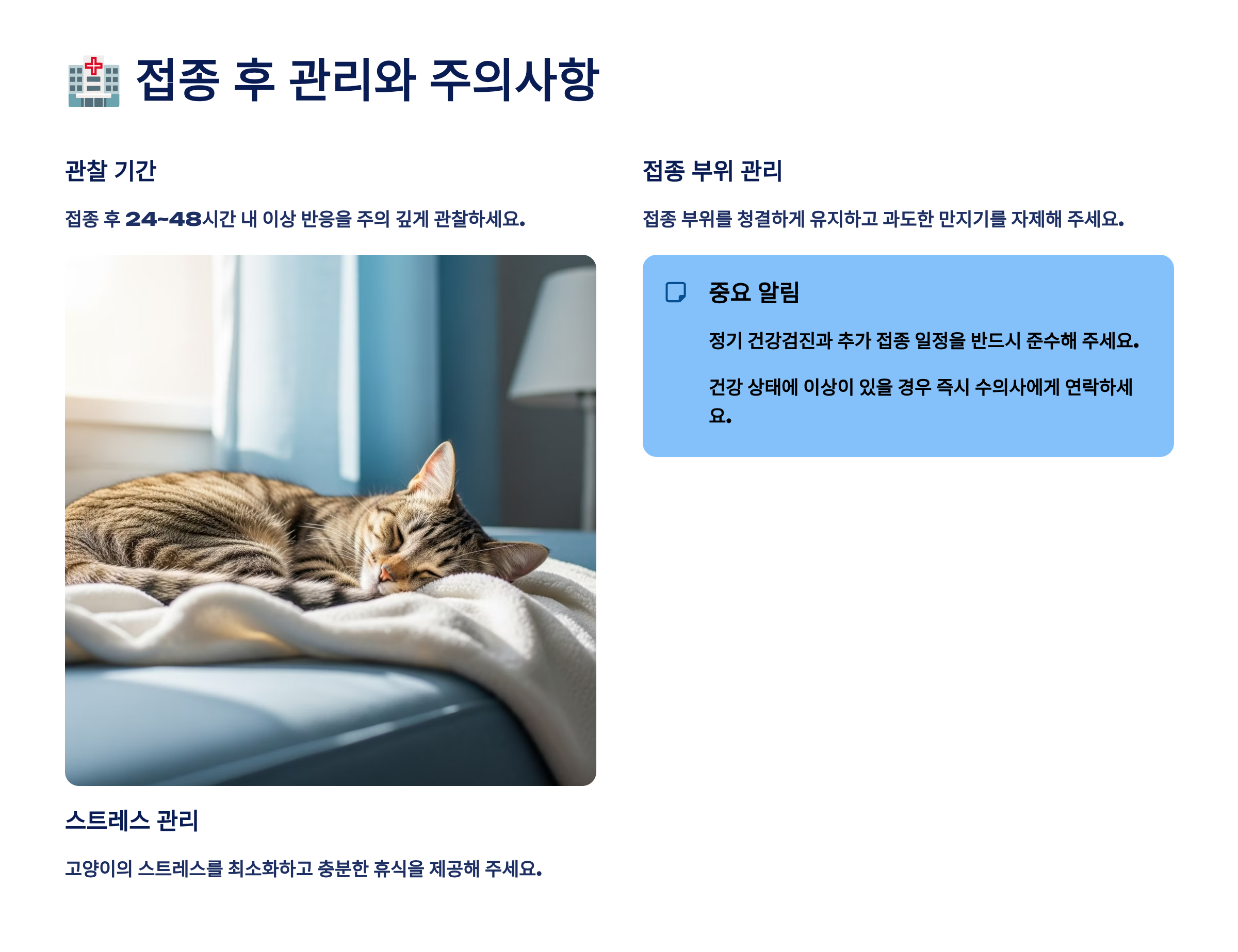 백신 접종 후 첫 24-48시간이 가장 중요한 관찰 기간이에요. 이 시간 동안 고양이의 행동 변화, 식욕, 체온 등을 주의 깊게 관찰해야 해요. 대부분의 부작용이 이 기간에 나타나기 때문에 집사님의 세심한 관찰이 필요하답니다. 접종 당일은 가능한 집에서 함께 시간을 보내며 고양이를 지켜봐 주세요. 🏡