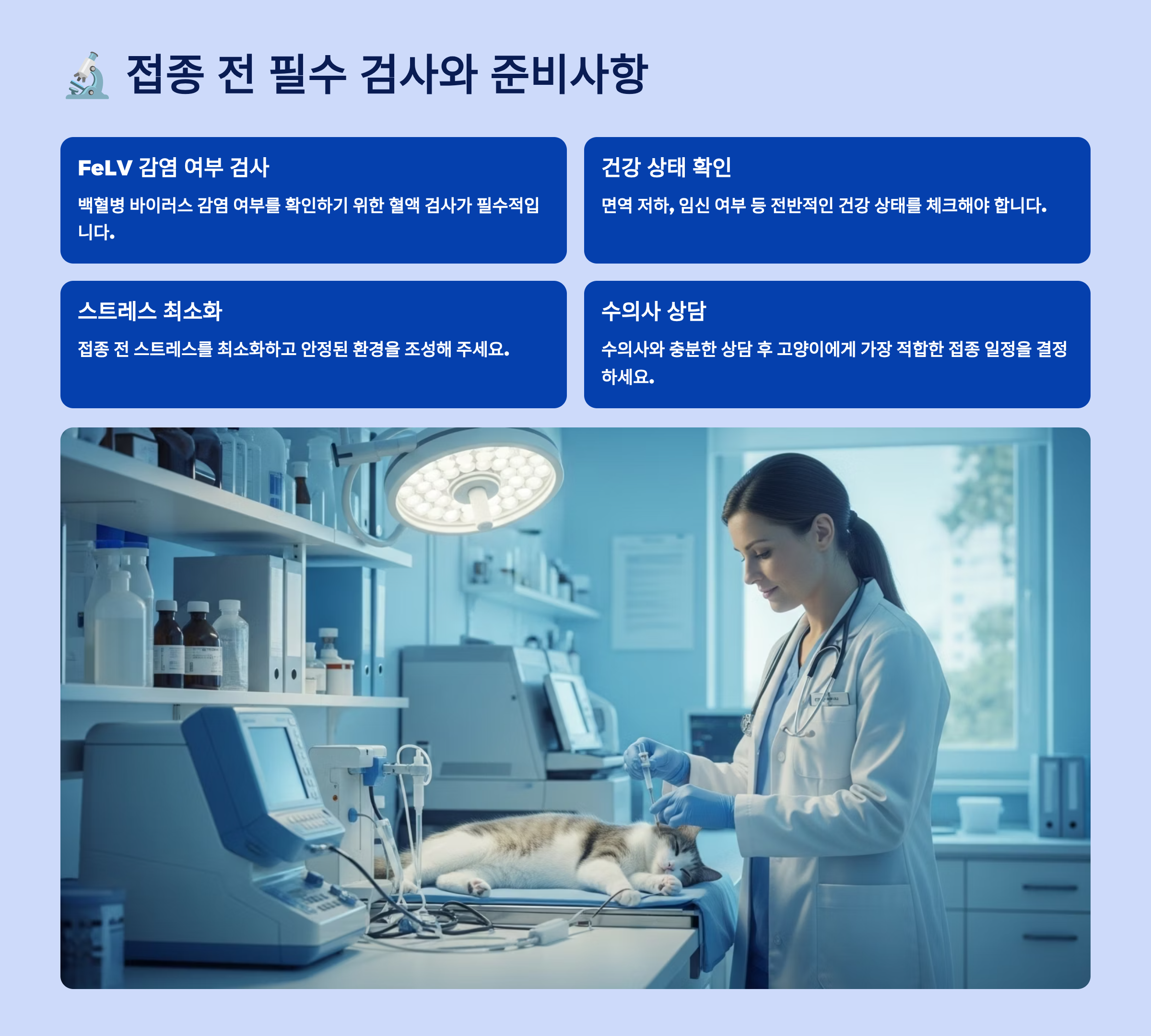 백혈병 예방접종 전 가장 중요한 것은 FeLV 감염 여부 확인이에요. 이미 감염된 고양이에게 백신을 접종해도 치료 효과가 없고, 오히려 불필요한 스트레스만 줄 수 있어요. 따라서 모든 고양이는 첫 접종 전에 반드시 FeLV 검사를 받아야 한답니다. 검사는 간단한 혈액 검사로 10-15분 내에 결과를 확인할 수 있어요. 🩸