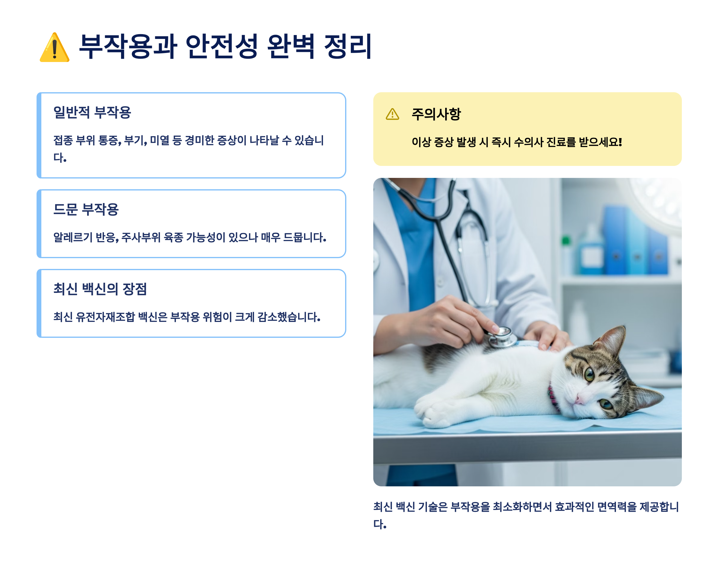 가장 우려되는 부작용은 주사부위육종(FISS)이에요. 이는 접종 부위에 악성 종양이 발생하는 것으로, 발생률은 1만-3만 마리당 1마리 정도로 매우 낮아요. 하지만 한번 발생하면 치료가 어렵기 때문에 예방이 중요해요. 최근에는 사지 말단부에 접종하여 만약의 경우 절단 수술이 가능하도록 하는 프로토콜이 권장되고 있답니다. 💉