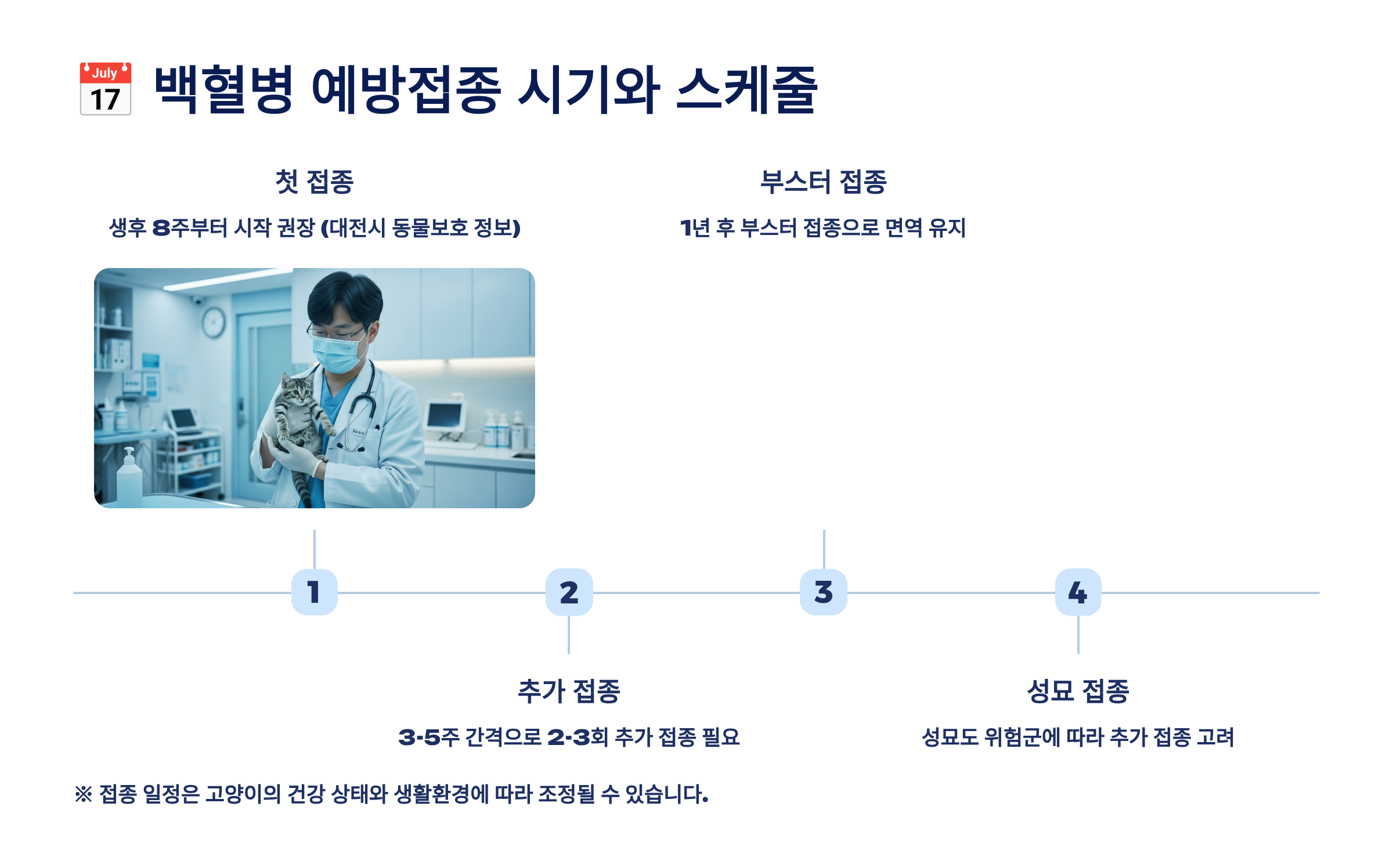 | 1차 접종 | 생후 8-9주 | FeLV 검사 필수 |
