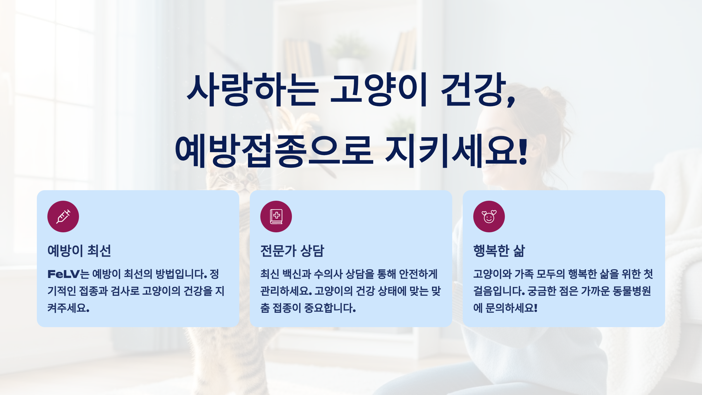 본 글에서 제공하는 고양이 백혈병 예방접종 관련 정보는 일반적인 참고 사항이며, 수의학적 진단이나 치료를 대체할 수 없습니다. 모든 의료적 결정은 반드시 자격을 갖춘 수의사와 상담 후 이루어져야 합니다. 백신 종류, 접종 시기, 부작용 등은 개체별로 차이가 있을 수 있으며, 본 정보는 2025년 1월 기준입니다.