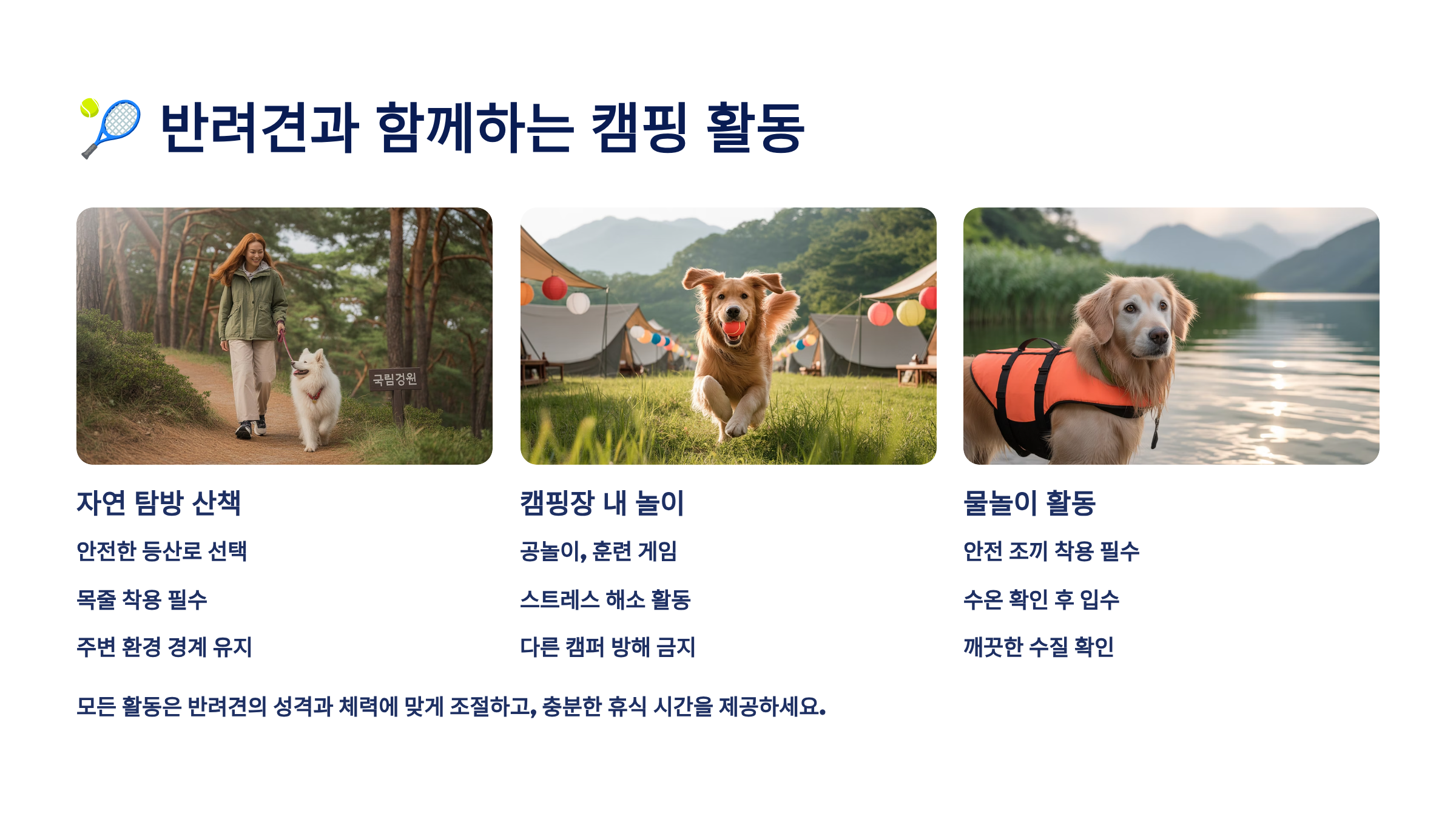 캠핑의 묘미는 역시 다양한 야외 활동이죠! 반려견과 함께라면 더욱 특별한 추억을 만들 수 있어요. 평소 도시에서는 경험하기 힘든 활동들을 마음껏 즐길 수 있는 기회랍니다. 코코와 함께한 활동들을 소개해드릴게요. 정말 행복한 시간들이었어요!