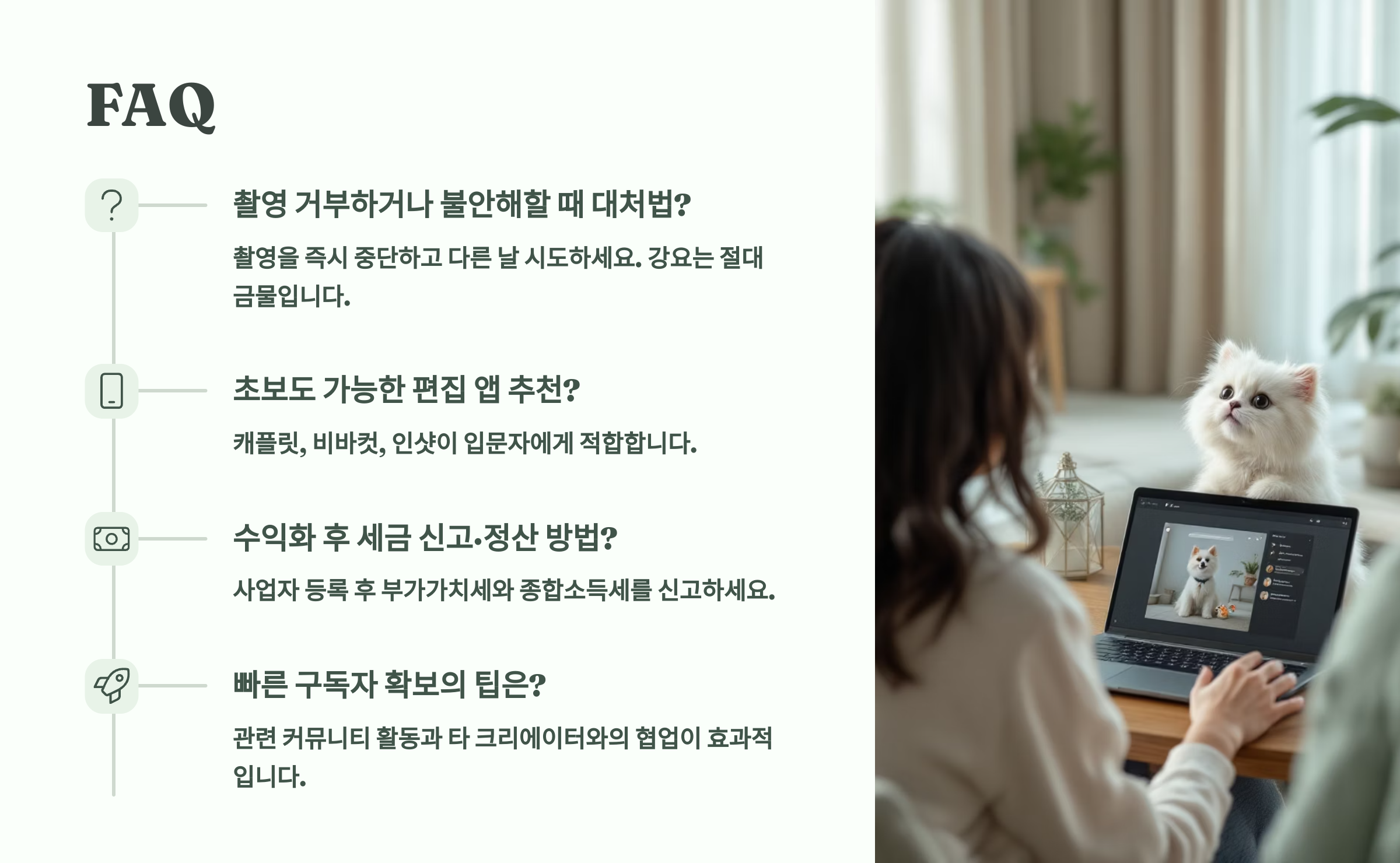 A5. 절대 안 돼요! 반려동물의 건강과 안전이 최우선이에요. 아프거나 컨디션이 좋지 않을 때는 촬영을 중단하고 충분히 쉬게 해주세요. 미리 예비 콘텐츠를 준비해두는 것도 좋은 방법이에요.
