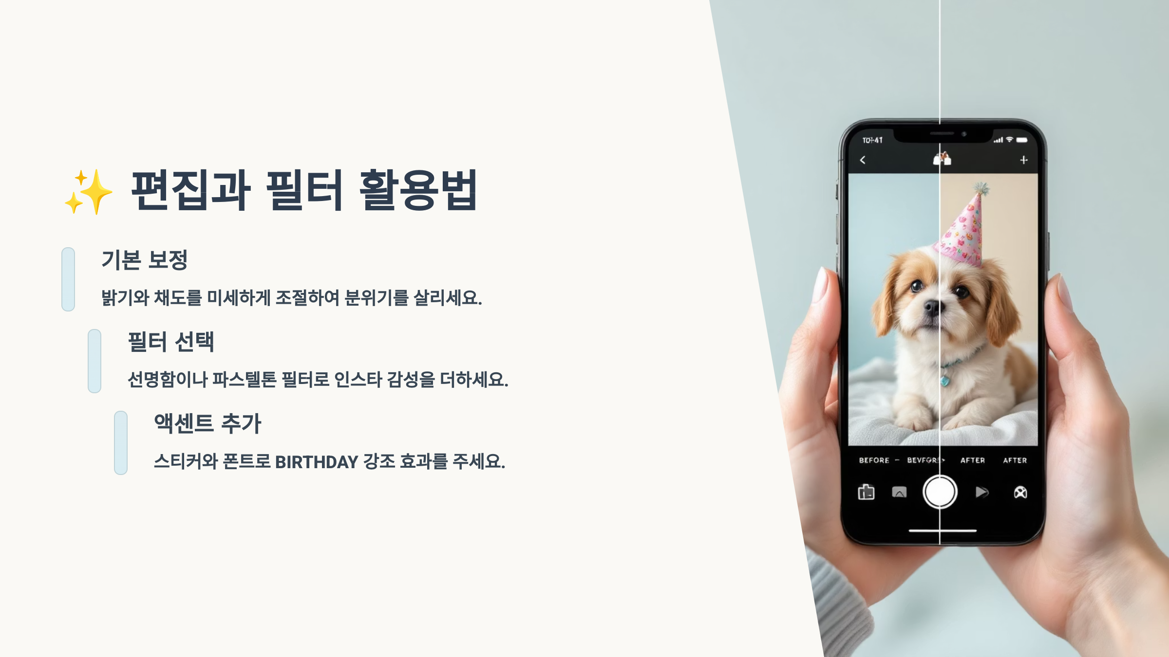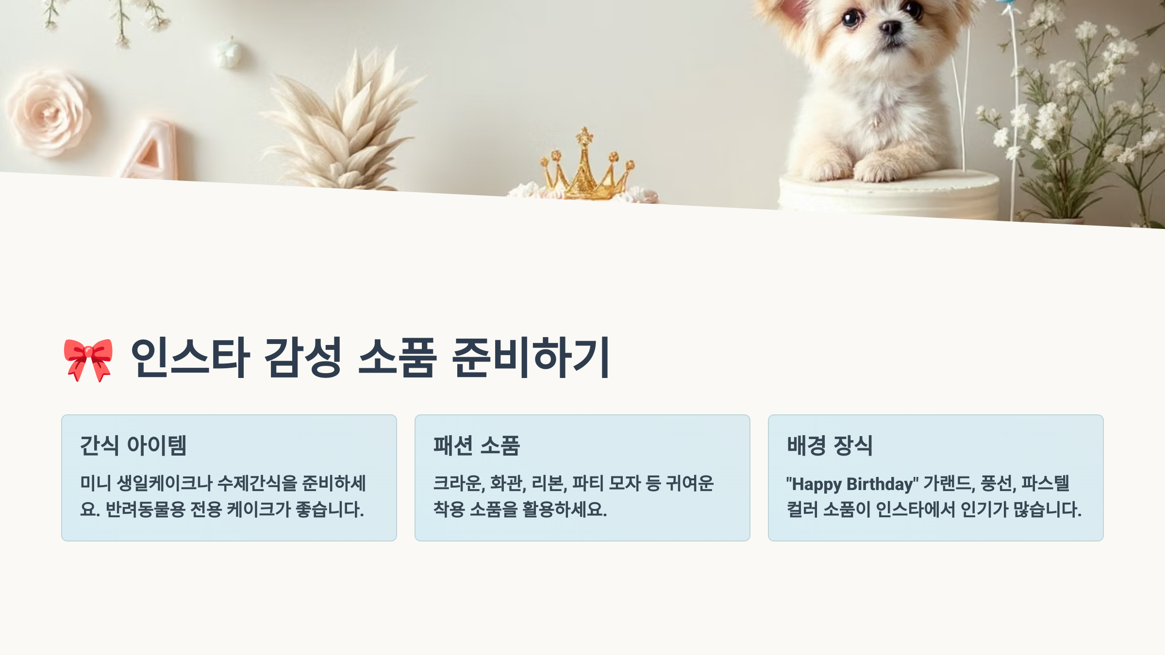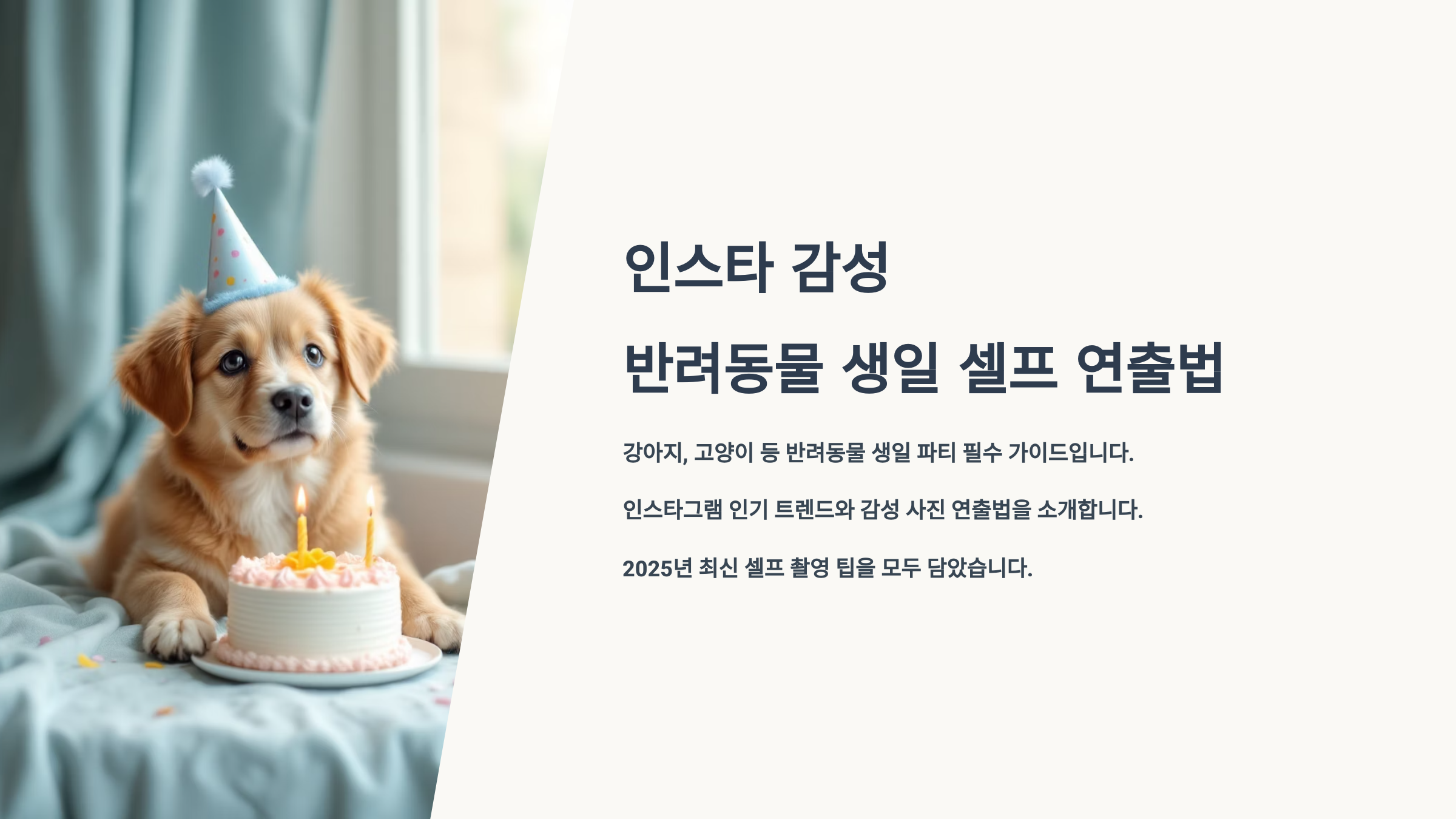 반려동물과 함께하는 특별한 순간을 인스타그램에 감성적으로 남기고 싶은 마음은 모든 펫 부모들의 공통된 바람이에요. 특히 소중한 아이의 생일은 일 년에 한 번뿐인 특별한 날이라서 더욱 의미 있게 기록하고 싶어하죠. 하지만 막상 촬영을 하려고 하면 반려동물이 가만히 있지 않거나, 원하는 만큼 예쁘게 나오지 않아서 고민이 많으실 거예요.