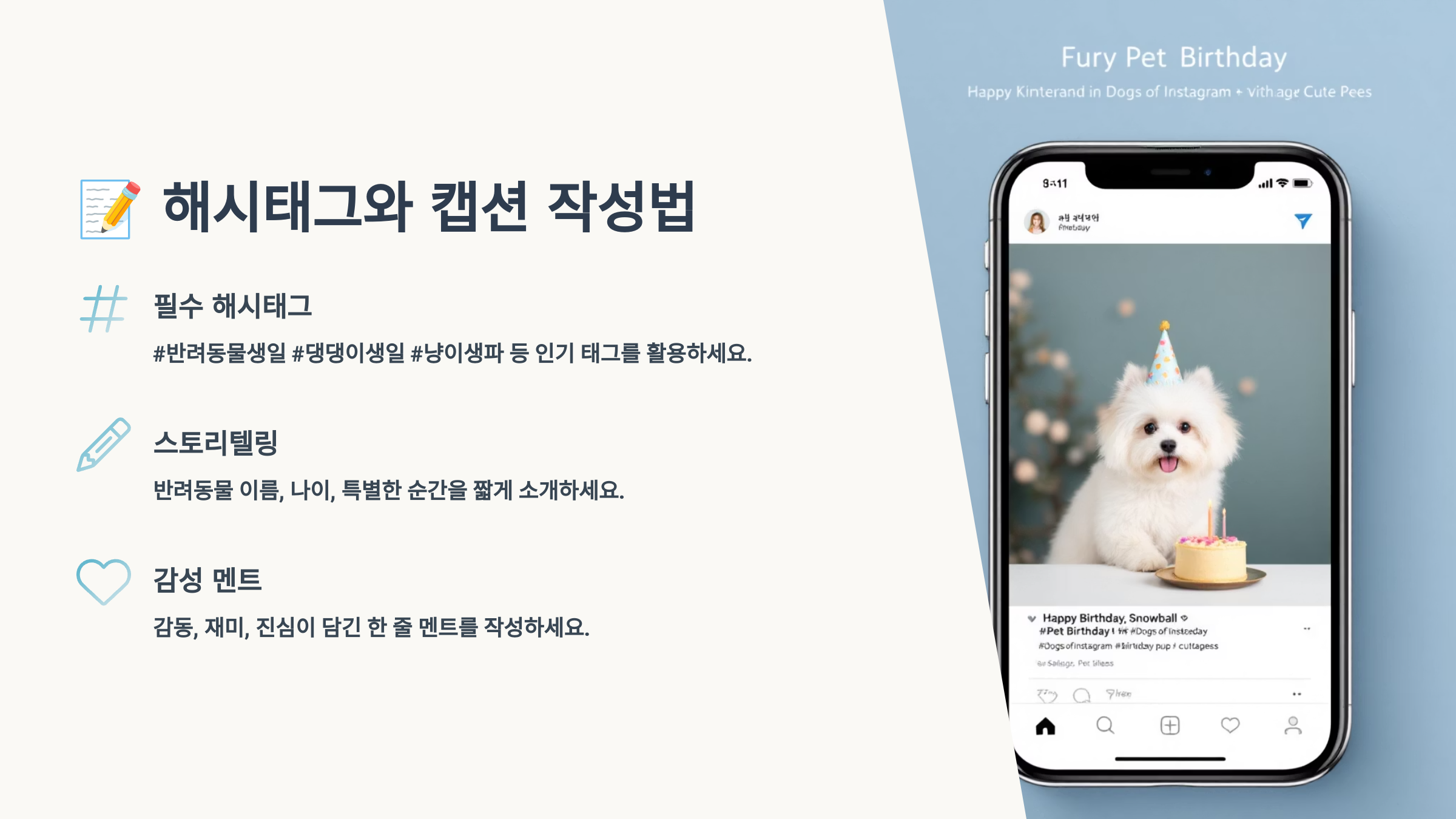 인스타그램에서 많은 사람들에게 사진을 노출시키려면 해시태그 전략이 필수예요. 하지만 무작정 인기 있는 해시태그만 사용하는 것보다는 우리 반려동물과 관련된 구체적이고 타겟팅된 해시태그를 활용하는 것이 더 효과적이에요. 반려동물 생일 사진의 경우에는 #반려동물생일, #펫버스데이, #멍생일, #냥생일 같은 기본적인 해시태그부터 시작해서, #골든리트리버생일, #페르시안고양이생일 처럼 견종이나 묘종을 구체적으로 명시한 해시태그까지 다양하게 활용해보세요.