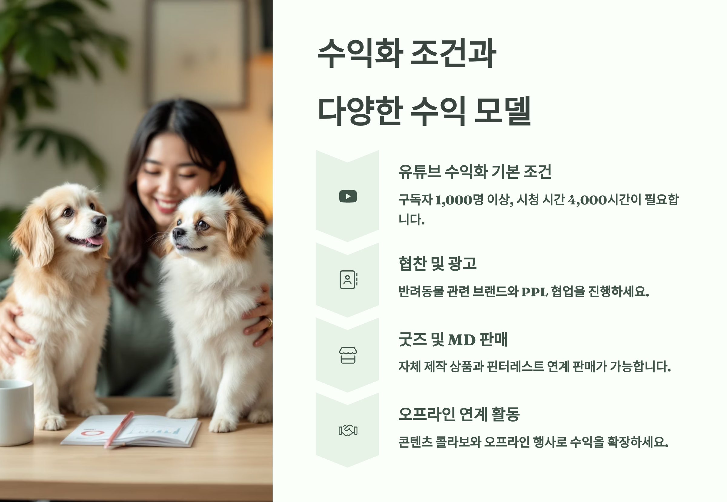 유튜브 파트너 프로그램의 수익화 조건은 구독자 1,000명과 지난 12개월간 총 시청시간 4,000시간이에요. 이 조건을 만족하면 광고 수익을 받을 수 있답니다. 반려동물 콘텐츠의 경우 평균적으로 6-12개월 정도면 이 조건을 달성할 수 있어요. 꾸준히 양질의 콘텐츠를 올리고 적극적으로 홍보하면 더 빨리 달성할 수도 있어요.