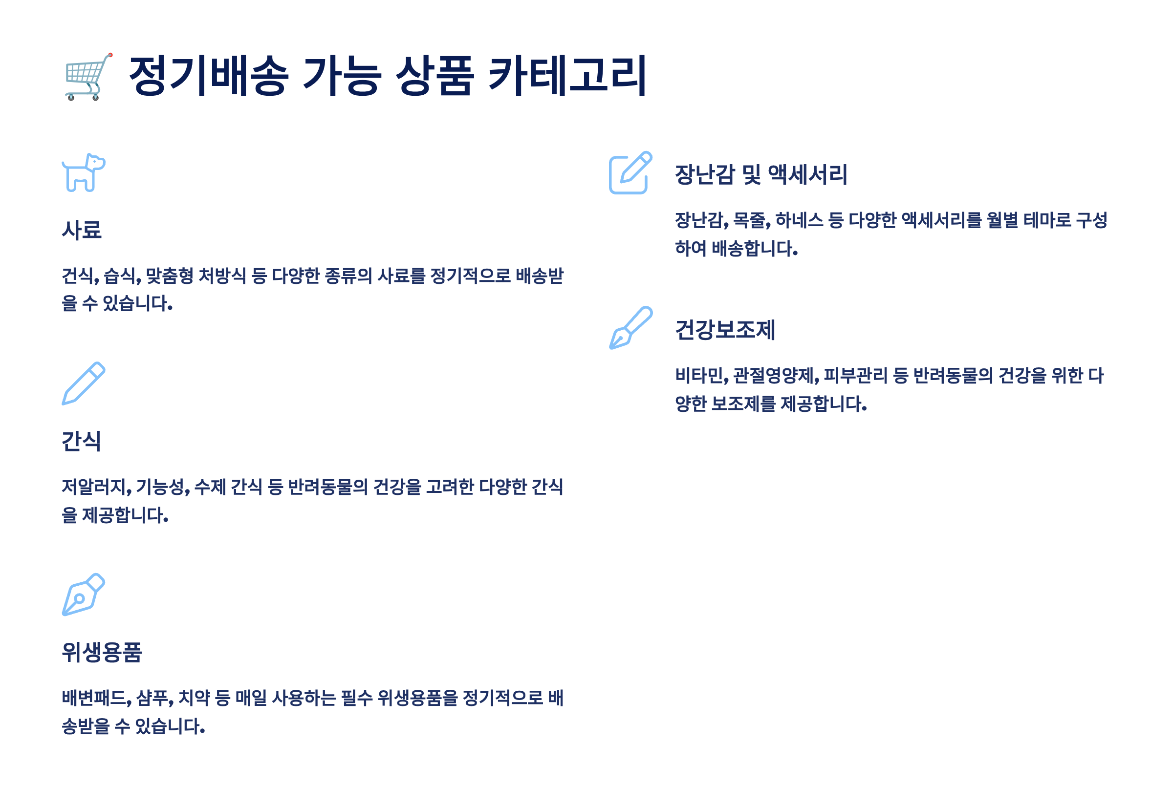 무엇보다 중요한 것은 우리 반려동물의 건강과 행복이에요. 정기배송 서비스를 통해 절약한 시간과 비용으로 반려동물과 더 많은 추억을 만들어가시길 바라요. 산책 한 번 더 가고, 놀이 시간을 조금 더 늘리는 것만으로도 우리 아이들은 충분히 행복할 거예요.