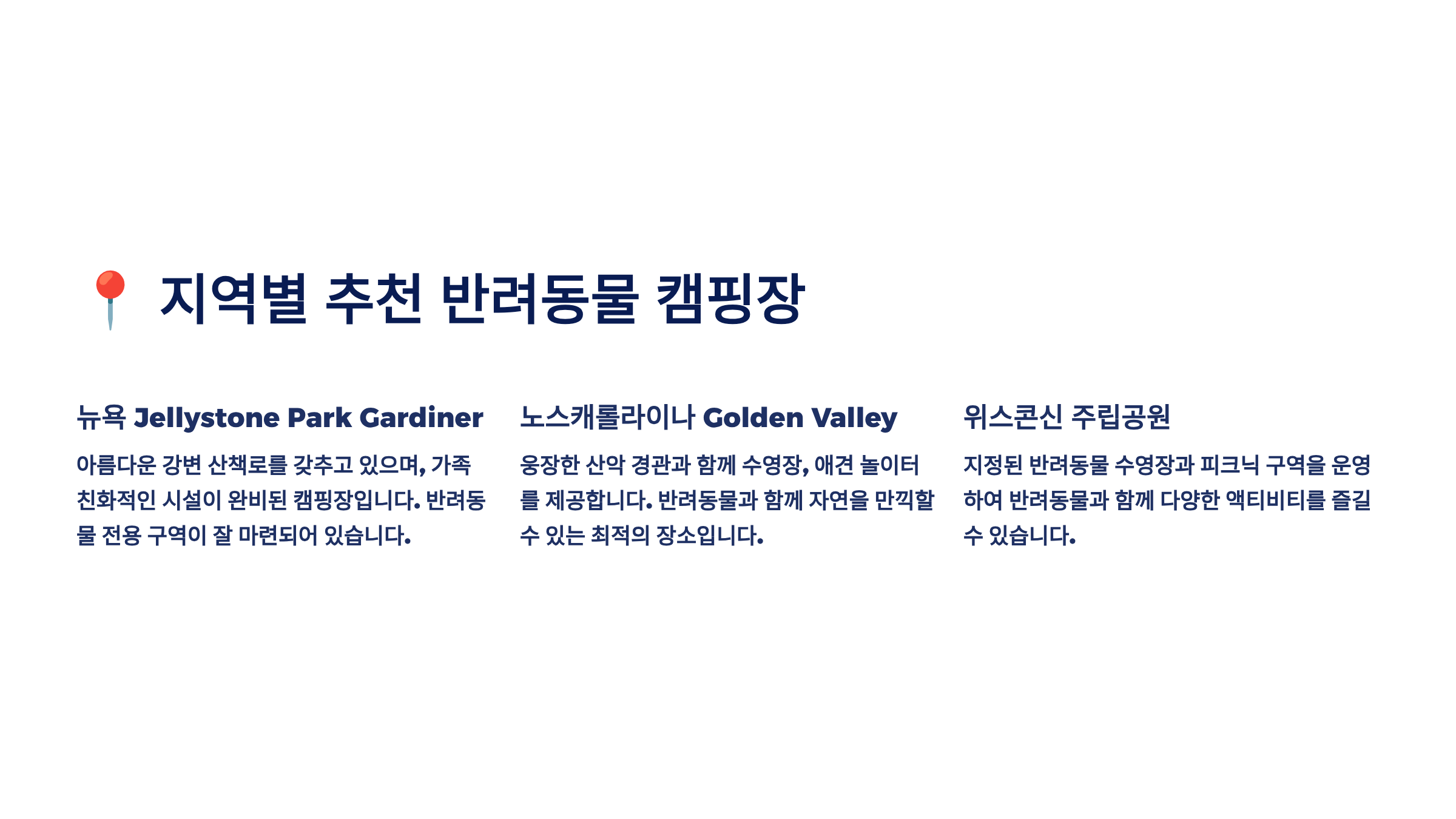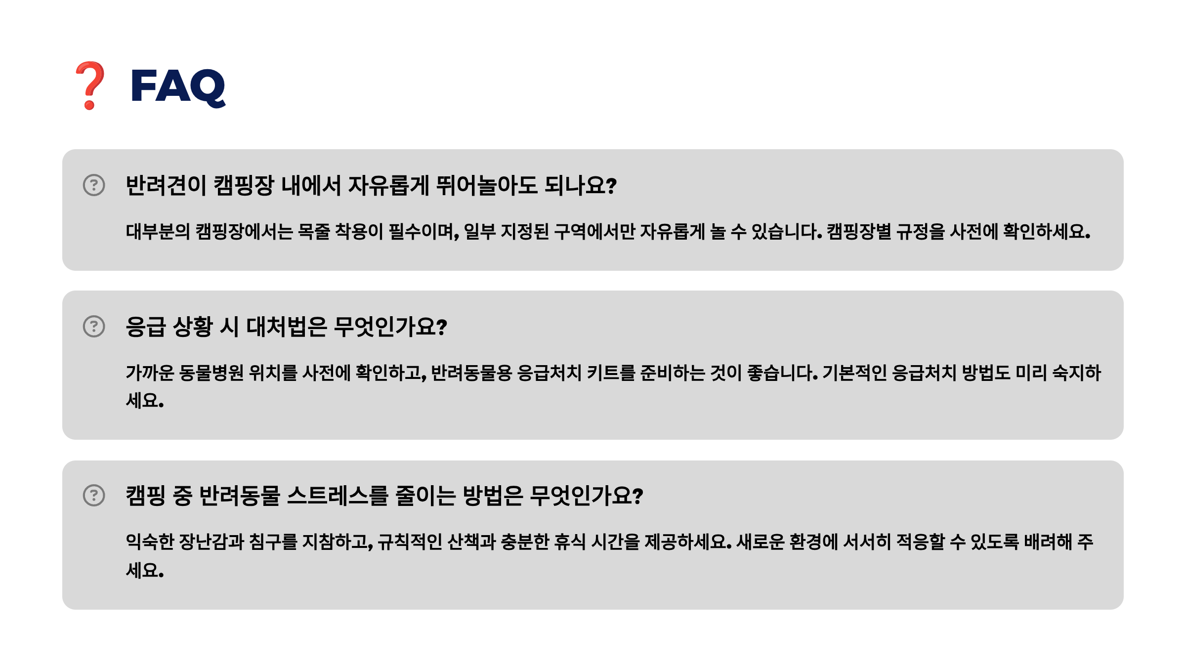 | 일반 캠핑장 펫존 | 구역 분리 운영 | 선택의 폭이 넓음 | 시설이 제한적일 수 있음 |