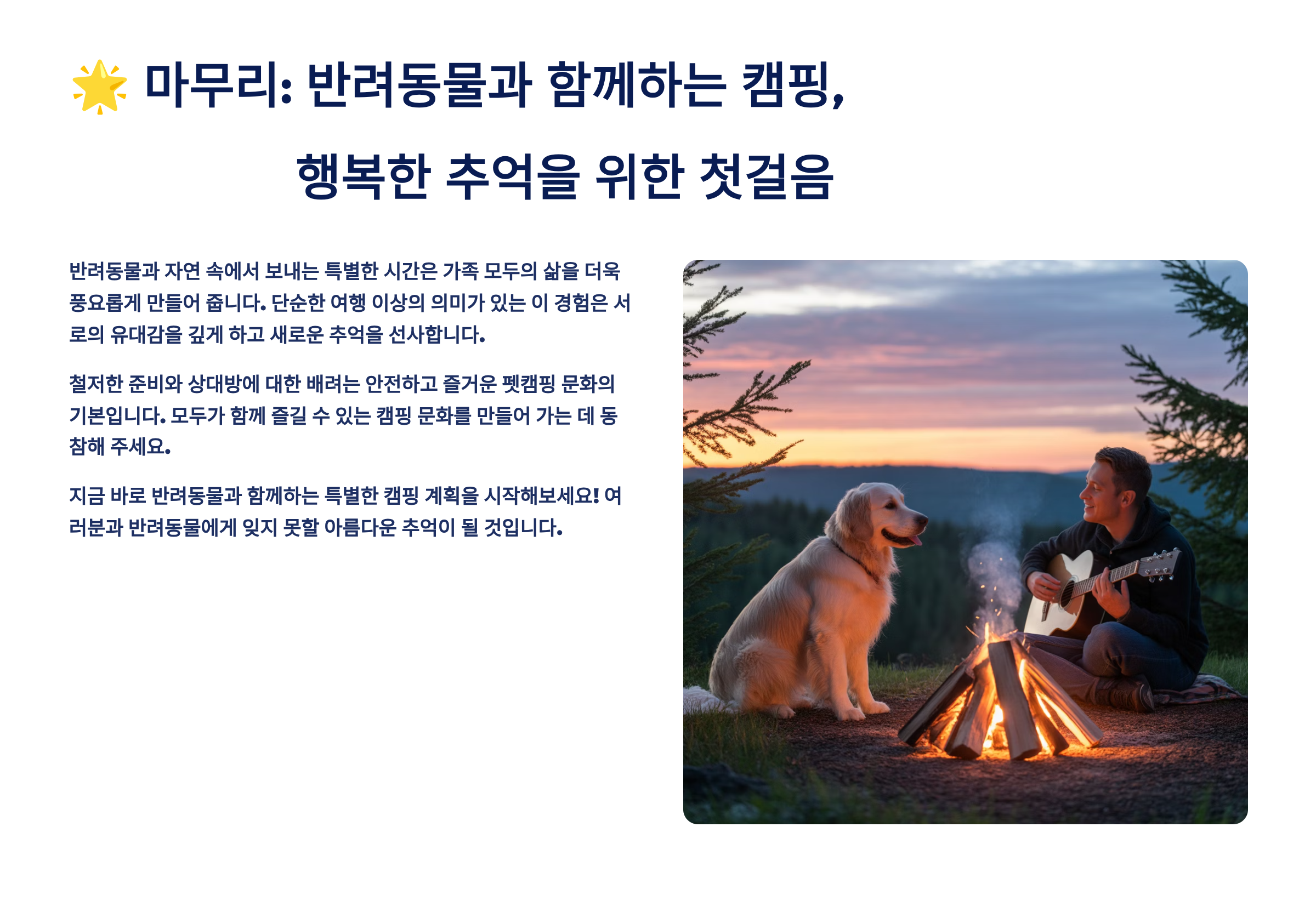 이제 여러분도 반려동물과 함께 특별한 캠핑 추억을 만들 준비가 되셨나요? 충분한 준비와 서로를 향한 사랑만 있다면, 분명 잊지 못할 멋진 경험이 될 거예요. 자연 속에서 반려동물과 함께 행복한 시간을 보내시길 바라며, 안전하고 즐거운 펫캠핑 되세요! 🏕️🐾