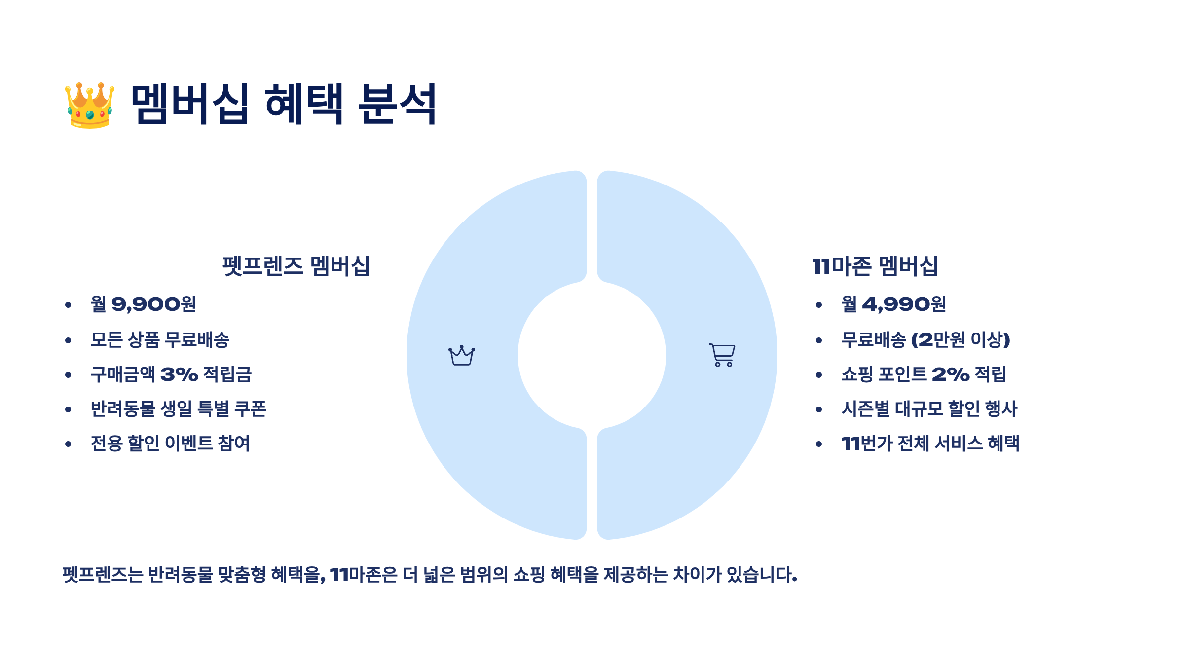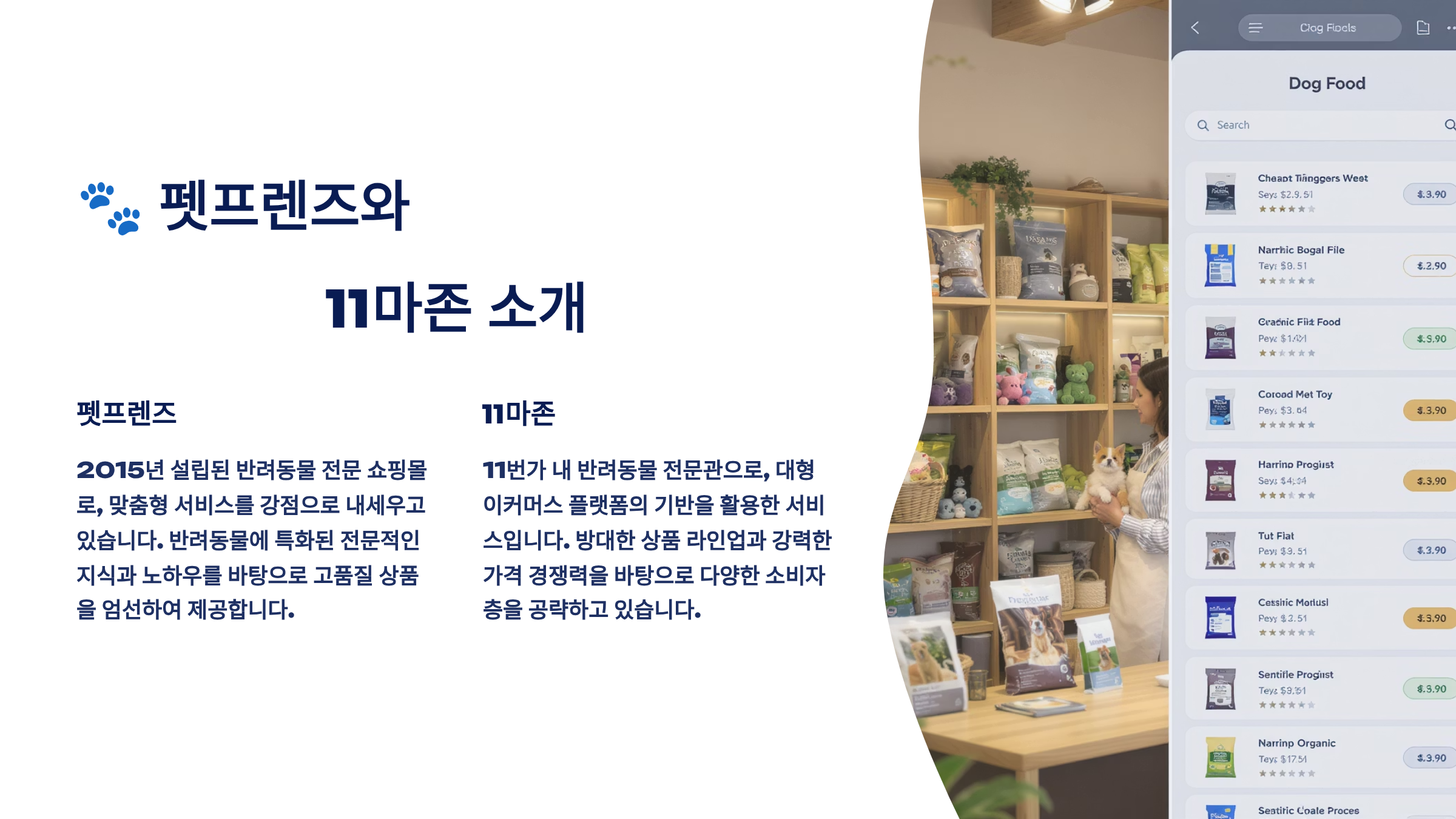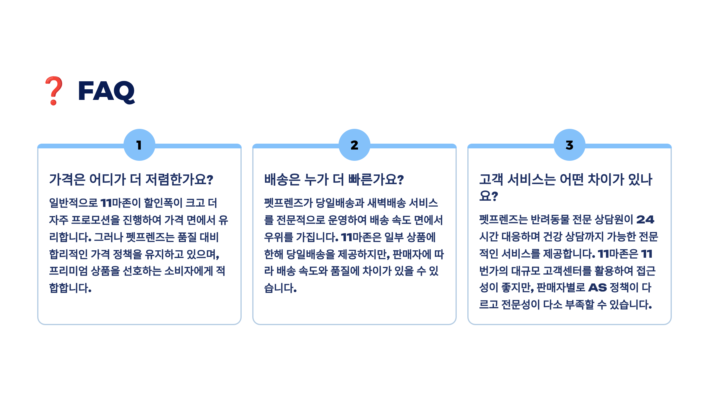 고객 충성도 면에서는 펫프렌즈가 앞서고 있어요. 반려동물 전문 플랫폼이라는 정체성이 명확하고, 집사님들 사이에서 신뢰도가 높죠. 반면 11마존은 아직 인지도를 높이는 단계에 있지만, 11번가의 브랜드 파워와 마케팅 역량을 바탕으로 빠르게 성장하고 있어요.