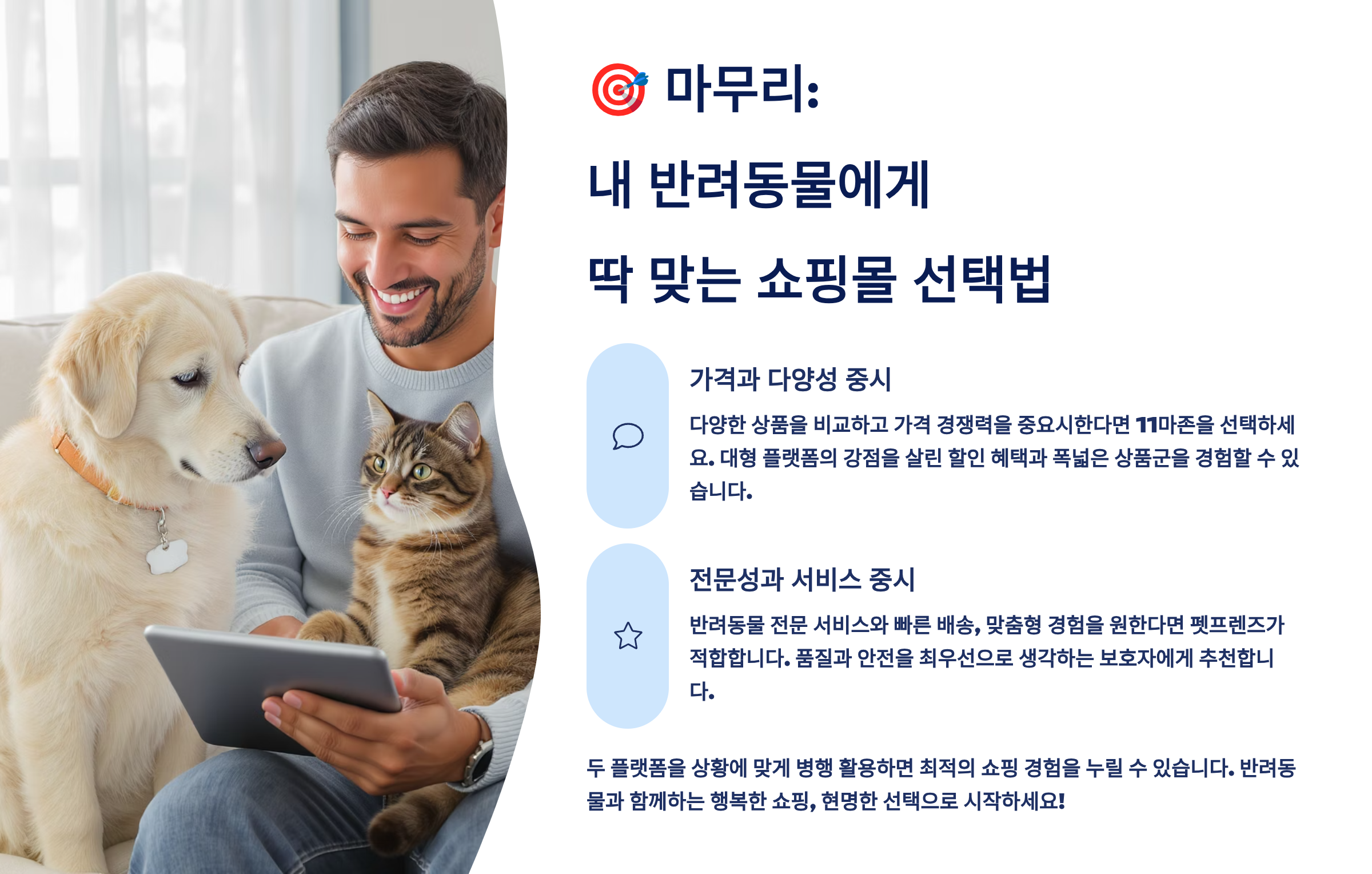 본 콘텐츠는 2025년 1월 기준으로 작성되었으며, 펫프렌즈와 11마존의 서비스 정책은 변경될 수 있습니다. 가격, 혜택, 배송 정책 등은 시기에 따라 달라질 수 있으므로 구매 전 각 플랫폼에서 최신 정보를 확인하시기 바랍니다. 본 비교 분석은 일반적인 정보 제공을 목적으로 하며, 특정 플랫폼을 추천하거나 보증하는 것은 아닙니다.