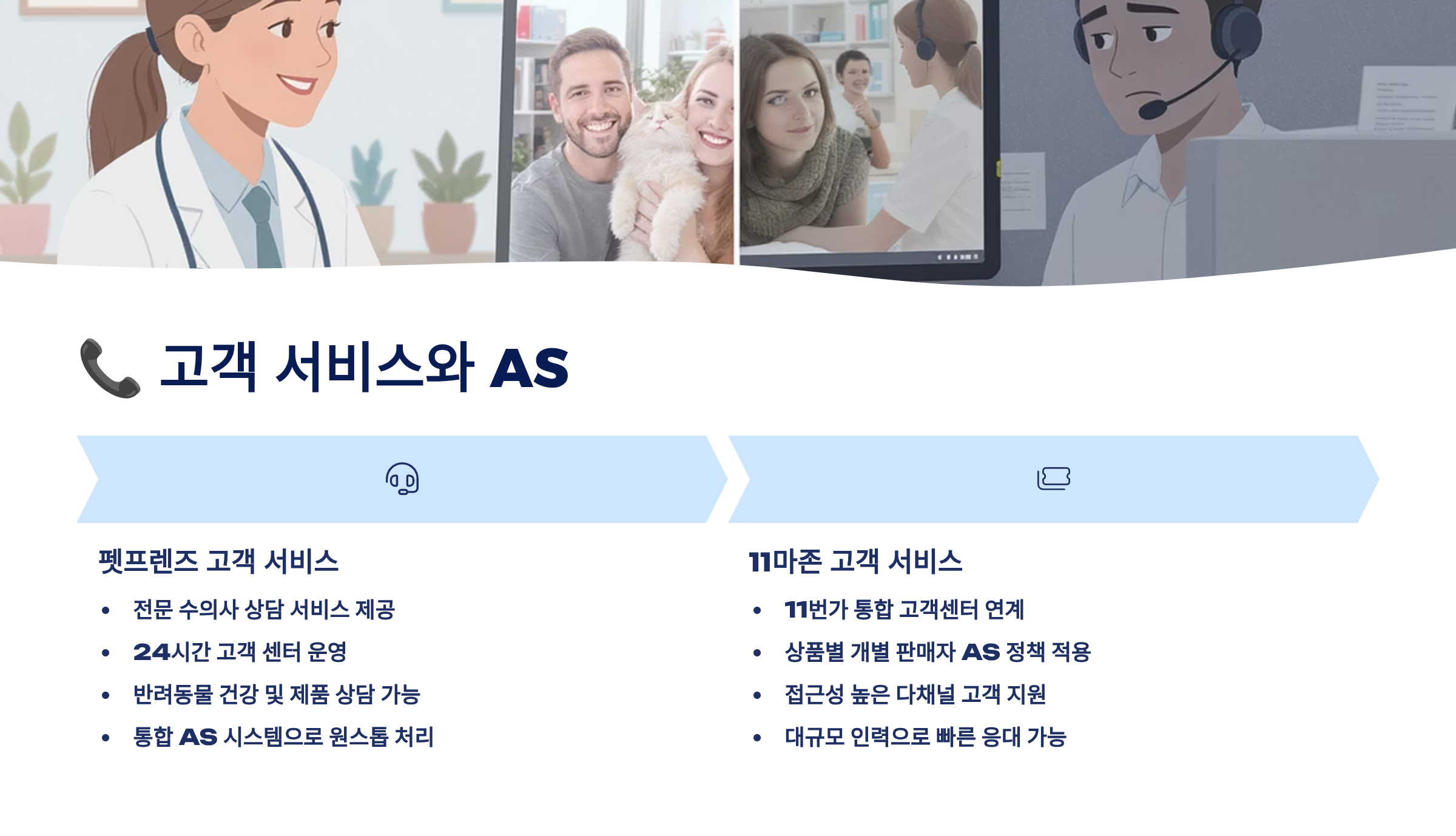 아무리 좋은 상품과 가격이라도 문제가 생겼을 때 제대로 해결해주지 않으면 소용없죠. 특히 반려동물 용품은 아이들의 건강과 직결되는 만큼 신속하고 정확한 고객 서비스가 필수예요. 펫프렌즈와 11마존의 고객 서비스 품질을 비교해볼게요.