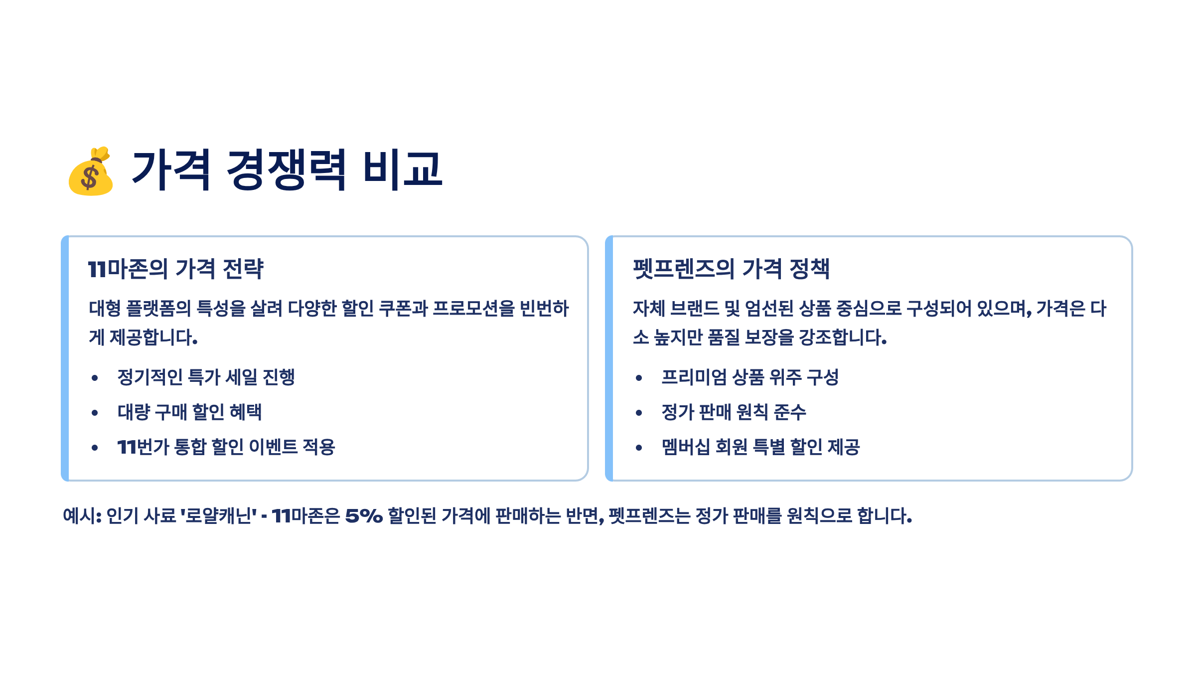 가격 비교 사이트들의 데이터를 종합해보면, 전반적으로 펫프렌즈가 약간 더 저렴한 편이에요. 하지만 11마존은 특정 기간 할인율이 더 높아서 타이밍을 잘 맞추면 더 저렴하게 구매할 수 있죠. 결국 자주 구매하는 제품의 가격과 본인의 쇼핑 패턴을 고려해서 선택하는 것이 현명해요! 💰