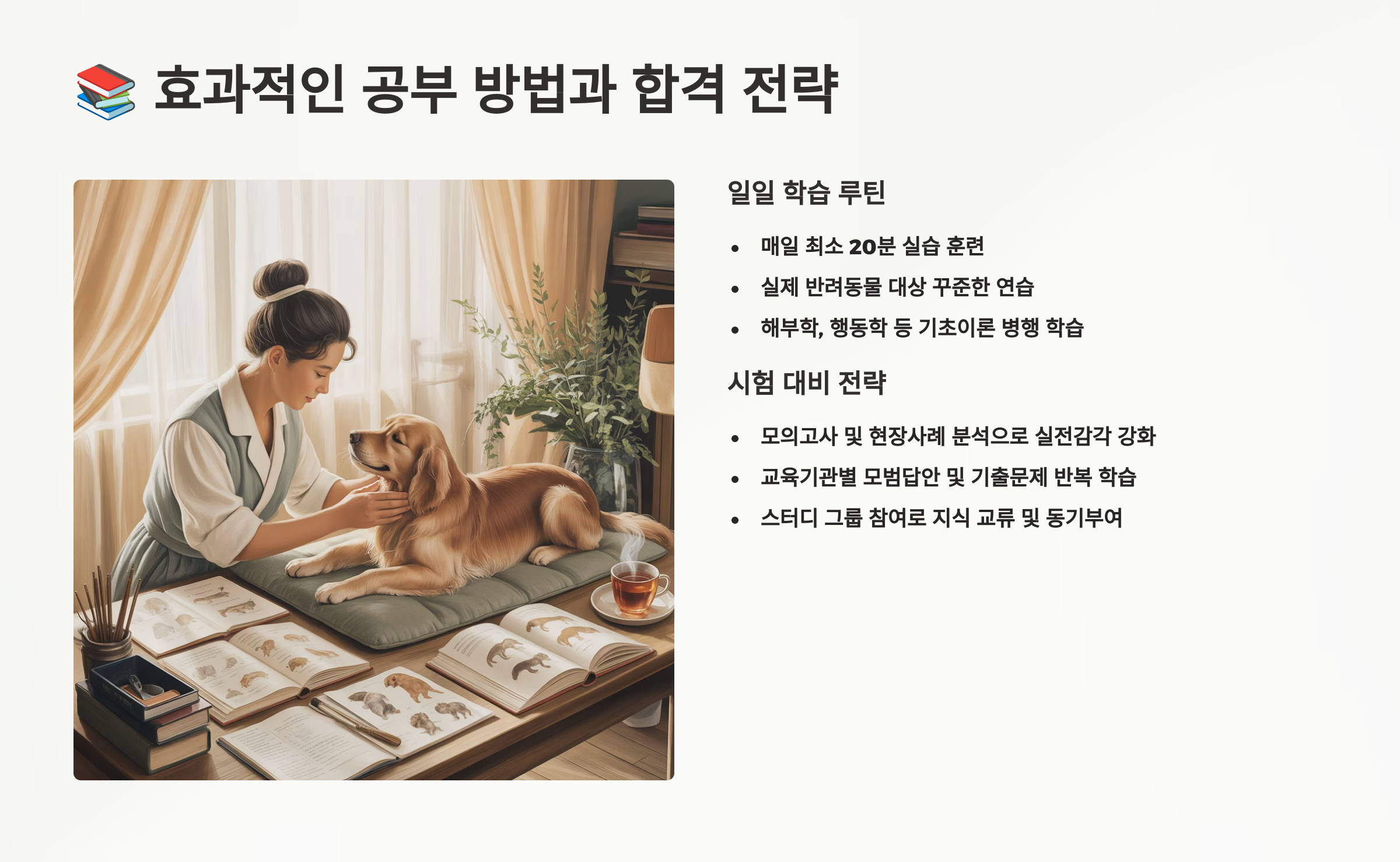 펫 마사지 자격증 시험에 합격하려면 이론과 실기를 균형 있게 준비해야 해요. 이론 공부의 경우 해부학이 가장 어렵게 느껴질 수 있는데, 3D 해부학 앱이나 유튜브 영상을 활용하면 훨씬 이해하기 쉬워요. 특히 '개와 고양이의 근골격계' 같은 전문 서적을 참고하면서 실제 반려동물의 몸을 만져보며 확인하는 것이 효과적이랍니다! 📖