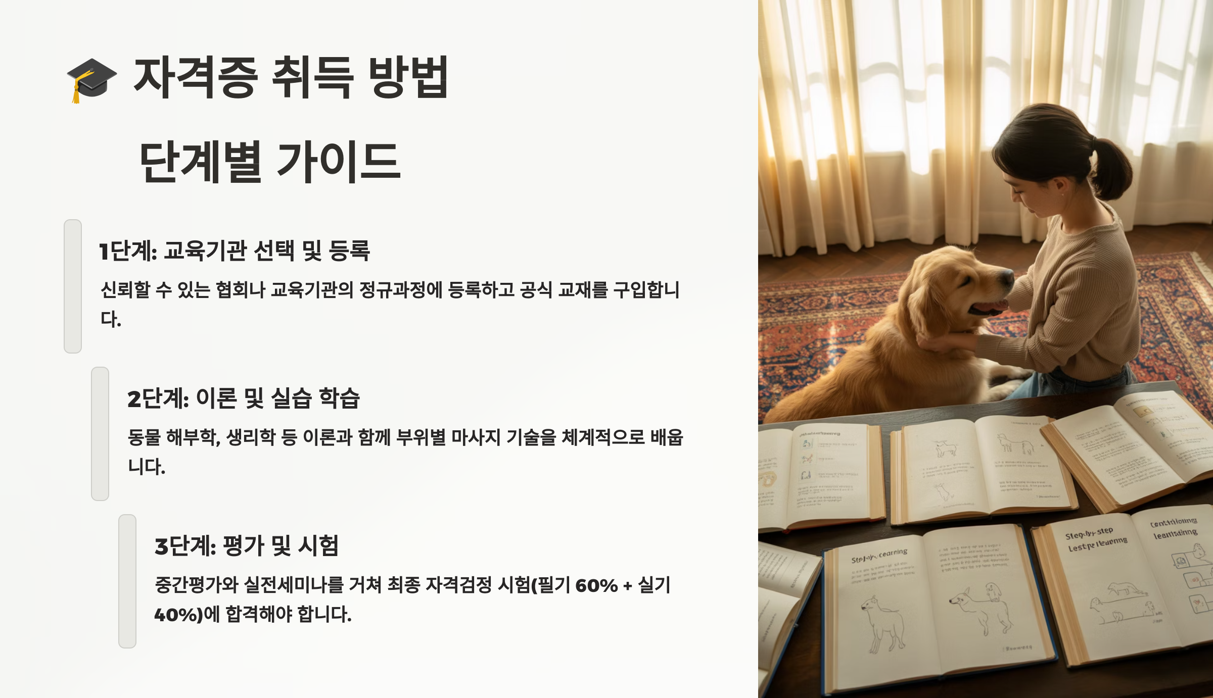 한국반려동물관리협회의 '반려동물 마사지 전문가' 자격증은 가장 대중적인 선택이에요. 총 60시간의 교육 과정으로 이론 30시간, 실습 30시간으로 구성되어 있고, 기초 해부학부터 마사지 기법, 행동학까지 폭넓게 다룬답니다. 특히 실습 비중이 높아 실무에 바로 적용할 수 있는 능력을 기를 수 있어요. 수료 후 필기시험과 실기시험을 통과하면 자격증을 취득할 수 있답니다.
