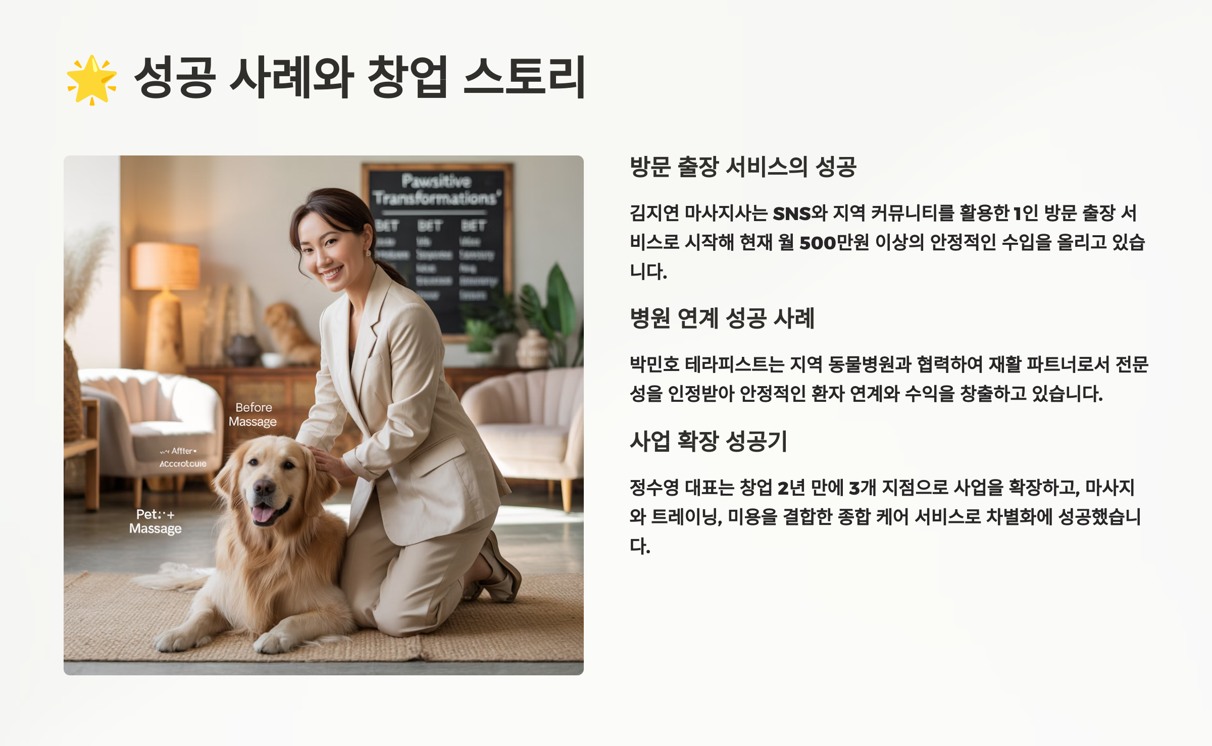 펫 마사지 분야에서 성공한 사례들을 보면 정말 영감을 받게 돼요! 서울 강남에서 '힐링펫 마사지'를 운영하는 김OO 대표는 대기업을 퇴사하고 펫 마사지사로 제2의 인생을 시작했어요. 처음에는 출장 서비스로 시작했지만, 3년 만에 매장 3개를 운영하는 CEO가 되었답니다. 월 매출 5,000만원을 달성하며 직원 10명을 고용하고 있어요! 🏆