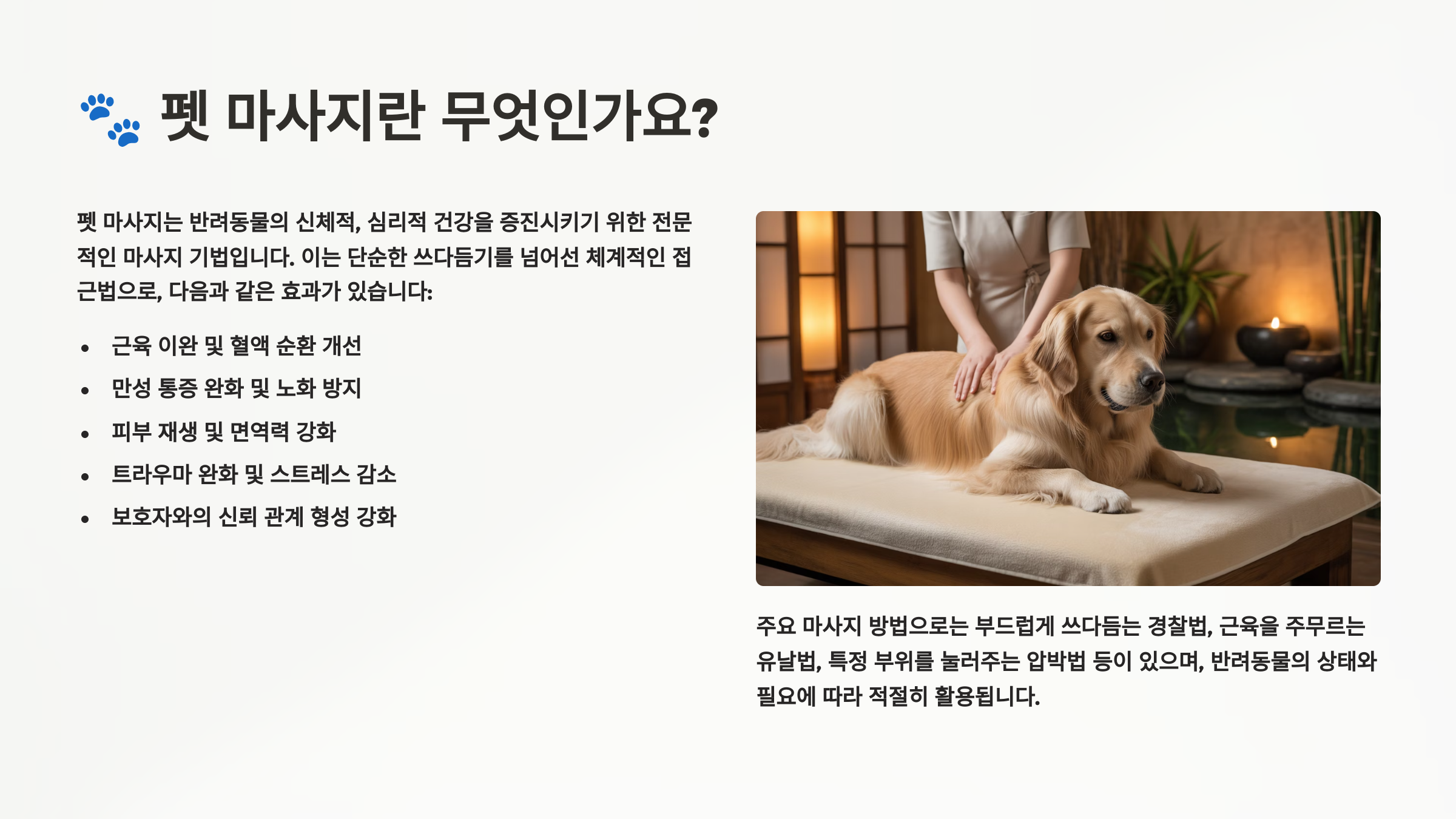 펫 마사지는 반려동물의 근육과 관절, 림프 순환을 개선하여 건강을 증진시키는 전문적인 테라피 기법이에요. 단순히 쓰다듬는 것과는 달리, 해부학적 지식을 바탕으로 특정 부위를 체계적으로 마사지하여 통증 완화, 스트레스 해소, 면역력 강화 등의 효과를 얻을 수 있답니다. 특히 수술 후 재활이나 노령견 케어에 탁월한 효과를 보여요! 🙌