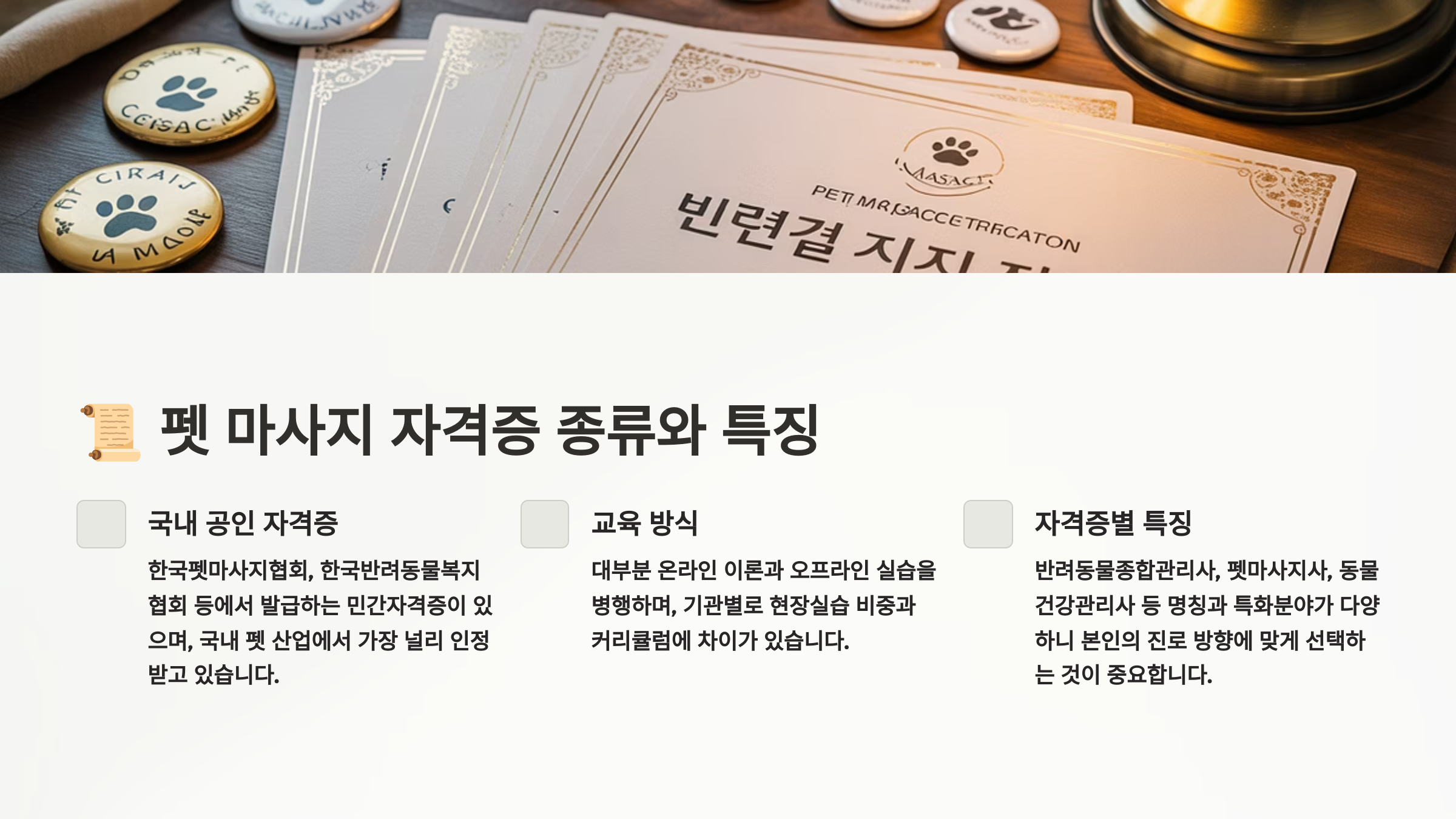 펫 마사지 자격증은 크게 민간자격증과 국제자격증으로 나뉘어요. 국내에서는 아직 국가공인 자격증이 없어 대부분 민간 협회에서 발급하는 자격증을 취득하게 되는데, 그중에서도 한국반려동물관리협회, 한국펫케어협회, 대한동물재활협회 등이 공신력 있는 기관으로 인정받고 있답니다. 각 협회마다 커리큘럼과 특징이 다르니 자신의 목적에 맞게 선택하는 것이 중요해요! 📋