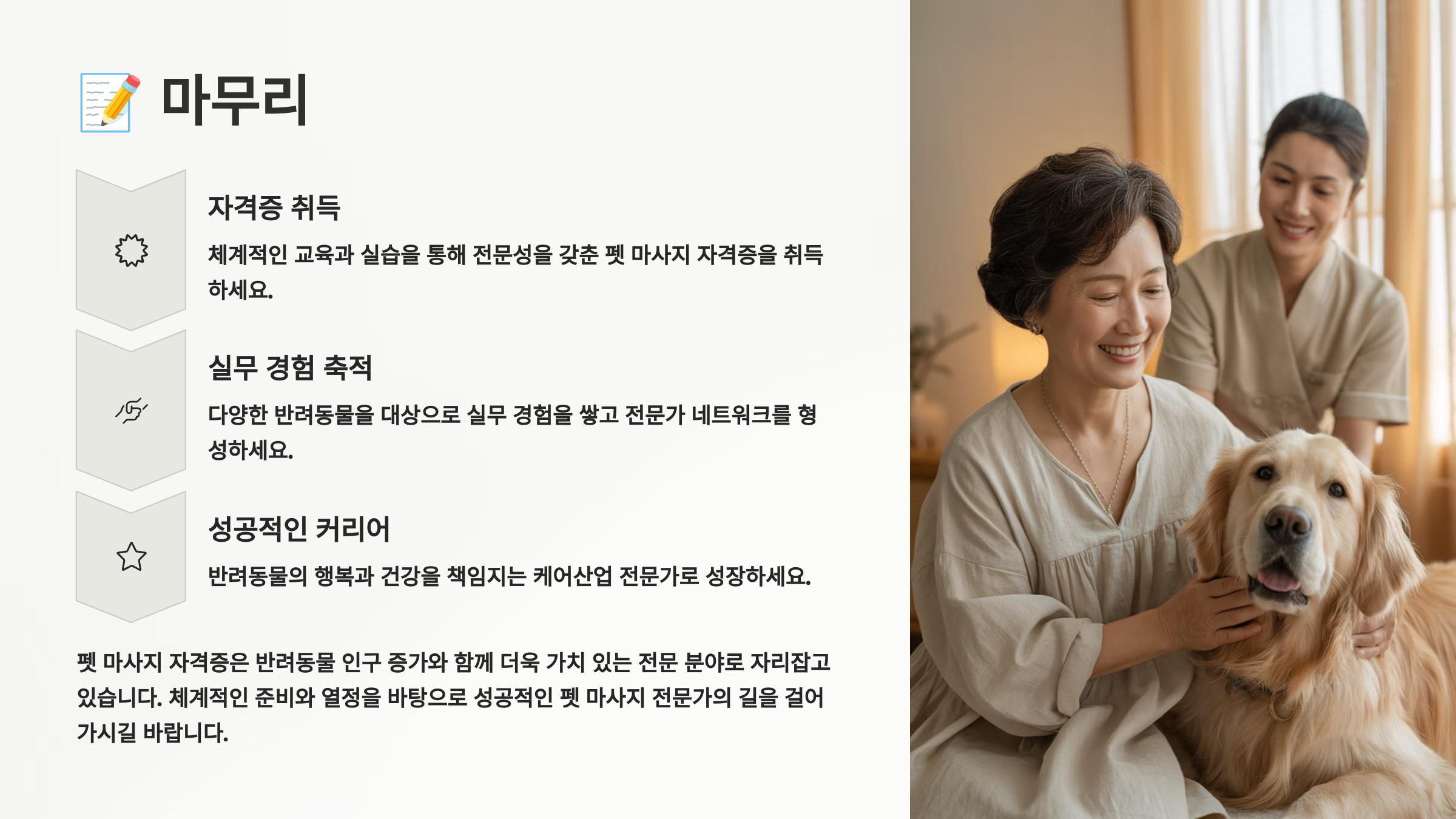 펫 마사지 자격증은 단순한 자격증이 아니라 반려동물과 함께하는 새로운 인생의 시작이에요. 전문적인 지식과 기술을 바탕으로 반려동물의 건강과 행복에 기여하면서, 동시에 안정적인 수입과 보람찬 직업 생활을 할 수 있답니다. 체계적인 교육과 꾸준한 노력으로 누구나 전문가가 될 수 있어요! 🎯