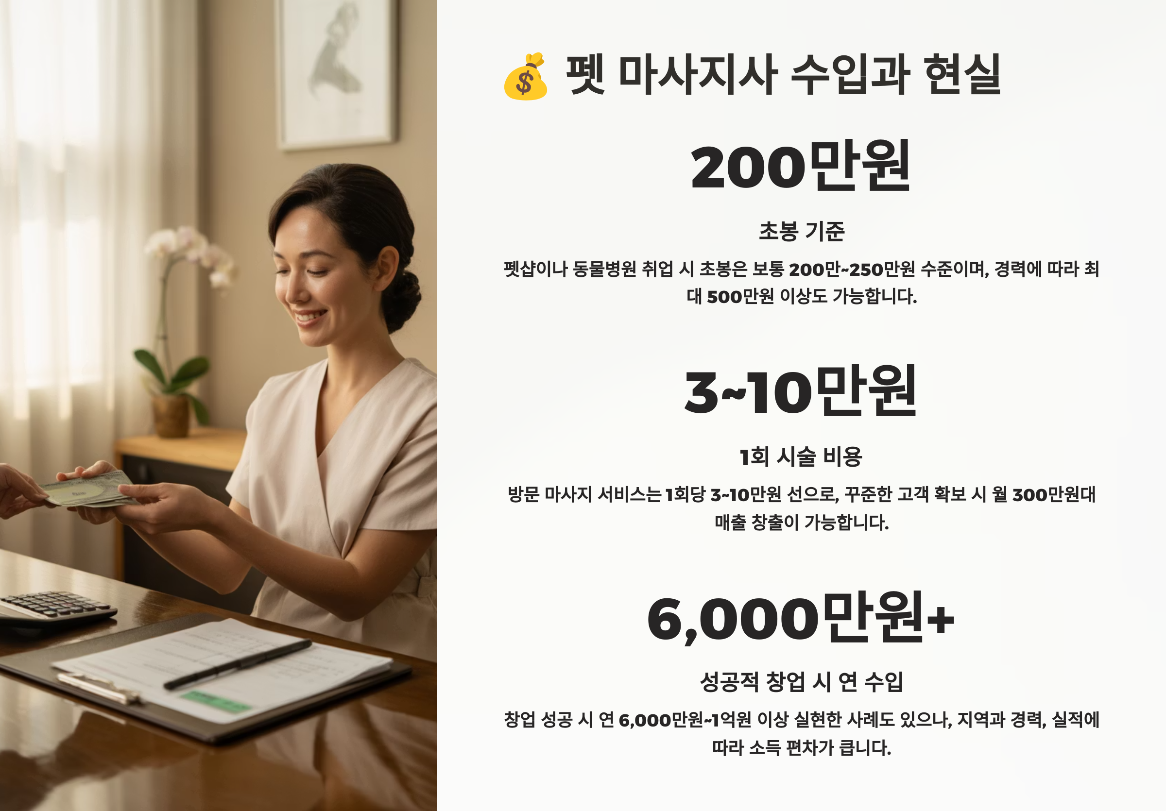 펫 마사지사의 수입은 근무 형태와 경력에 따라 천차만별이에요. 동물병원이나 펫 살롱에 정규직으로 취업한 경우, 신입 기준 월 250-300만원에서 시작해요. 경력 3년차가 되면 350-400만원, 5년차 이상이면 400-500만원까지도 가능하답니다. 특히 대형 동물병원이나 프랜차이즈 펫 샵에서는 복지 혜택도 좋은 편이에요! 💵