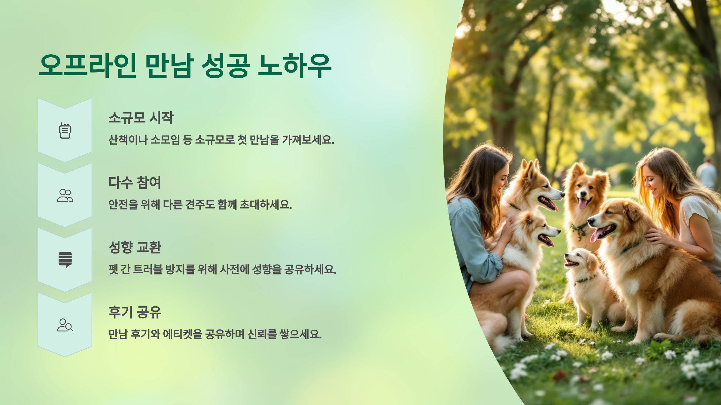 온라인에서 연결된 인연을 실제 만남으로 발전시키는 것은 또 다른 기술이 필요해요. 성공적인 오프라인 만남을 위해서는 세심한 계획과 준비가 중요하답니다. 먼저 만남 장소를 신중하게 선택해야 해요. 양쪽 반려동물 모두에게 스트레스가 적은 중립적인 장소가 좋고, 넓은 공간에서 자유롭게 움직일 수 있는 곳이 이상적이에요. 특히 처음 만나는 경우라면 울타리가 있는 애견 전용 공간이나 펜스로 구분된 공원 지역을 추천해요.