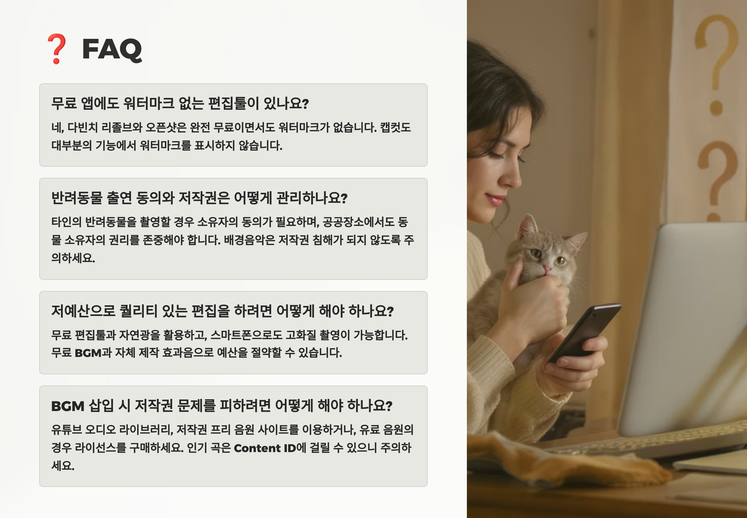 모든 FAQ를 읽어주셔서 감사해요! 이제 여러분도 펫 유튜브 편집 전문가예요! 🎊 지금 바로 시작해보세요!