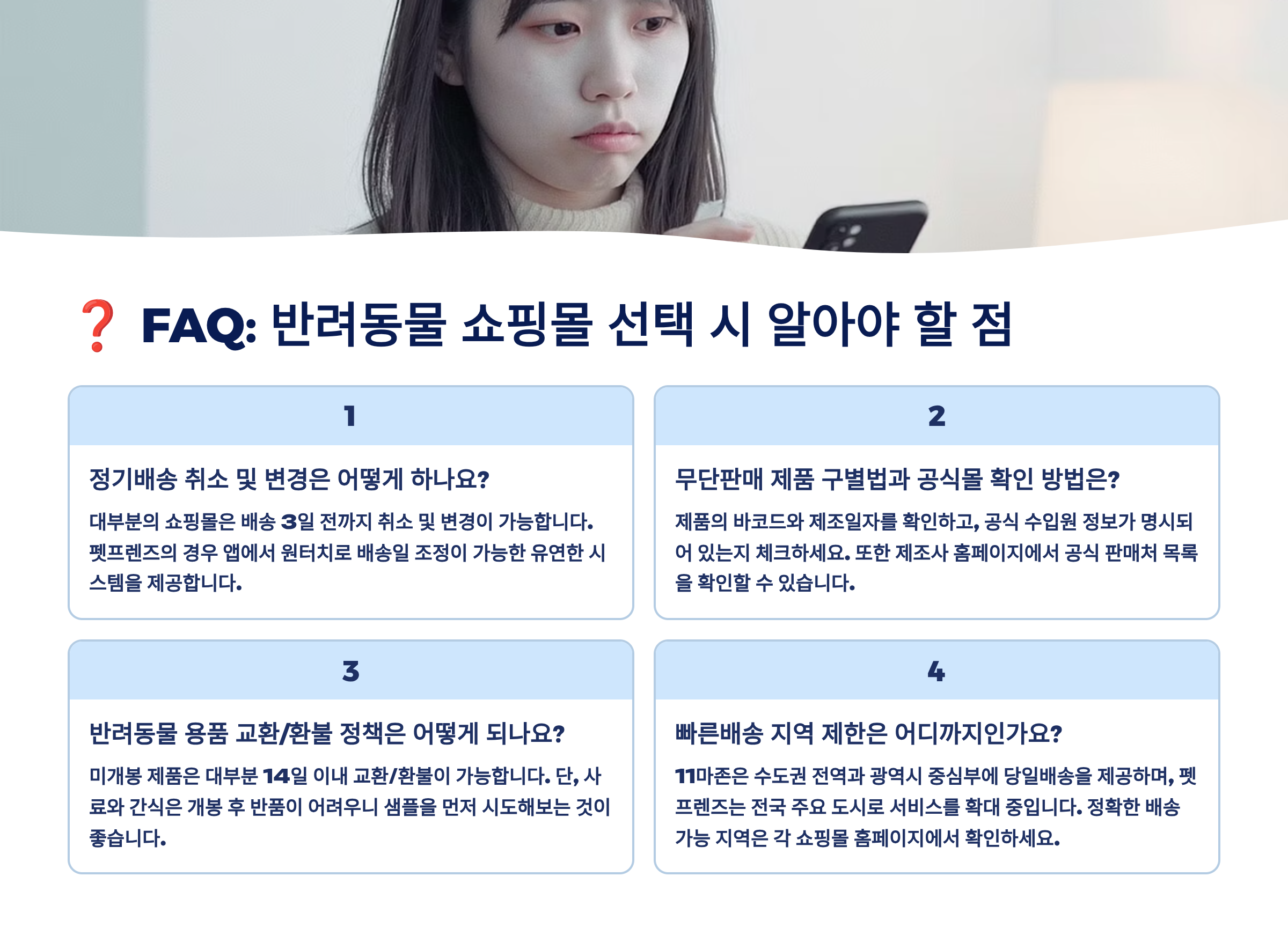 A3. 대부분의 펫샵은 정기배송 위약금이 없어요. 언제든지 일시정지나 해지가 가능하며, 다음 배송 3~5일 전까지만 변경하면 됩니다. 단, 첫 구매 특별할인을 받은 경우 일정 횟수 이상 구매 조건이 있을 수 있으니 약관을 확인하세요.