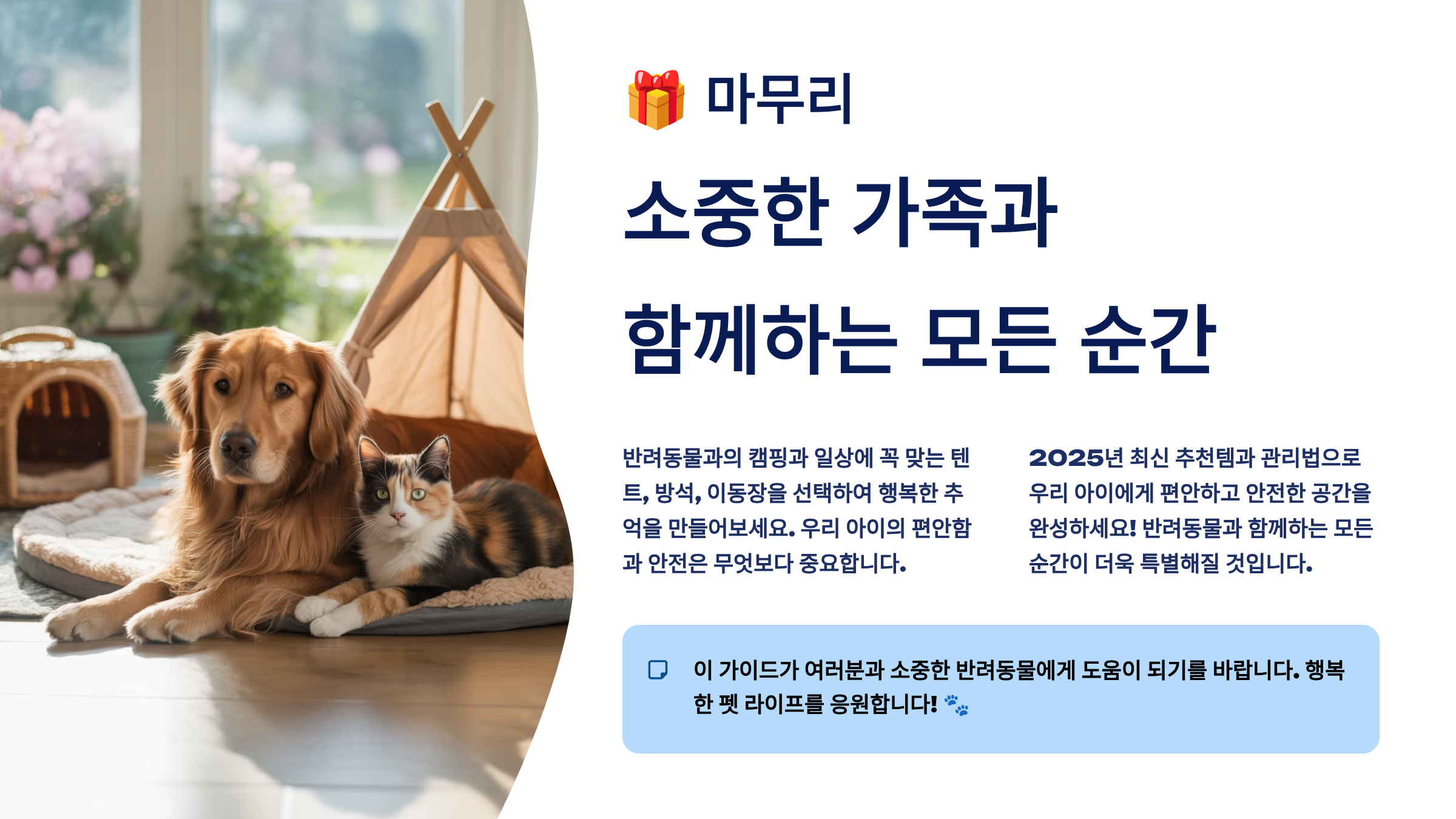 | 반려동물과 함께하는 캠핑 준비 가이드 (첫 캠핑부터 필수템까지) (0) | 2025.07.31 |