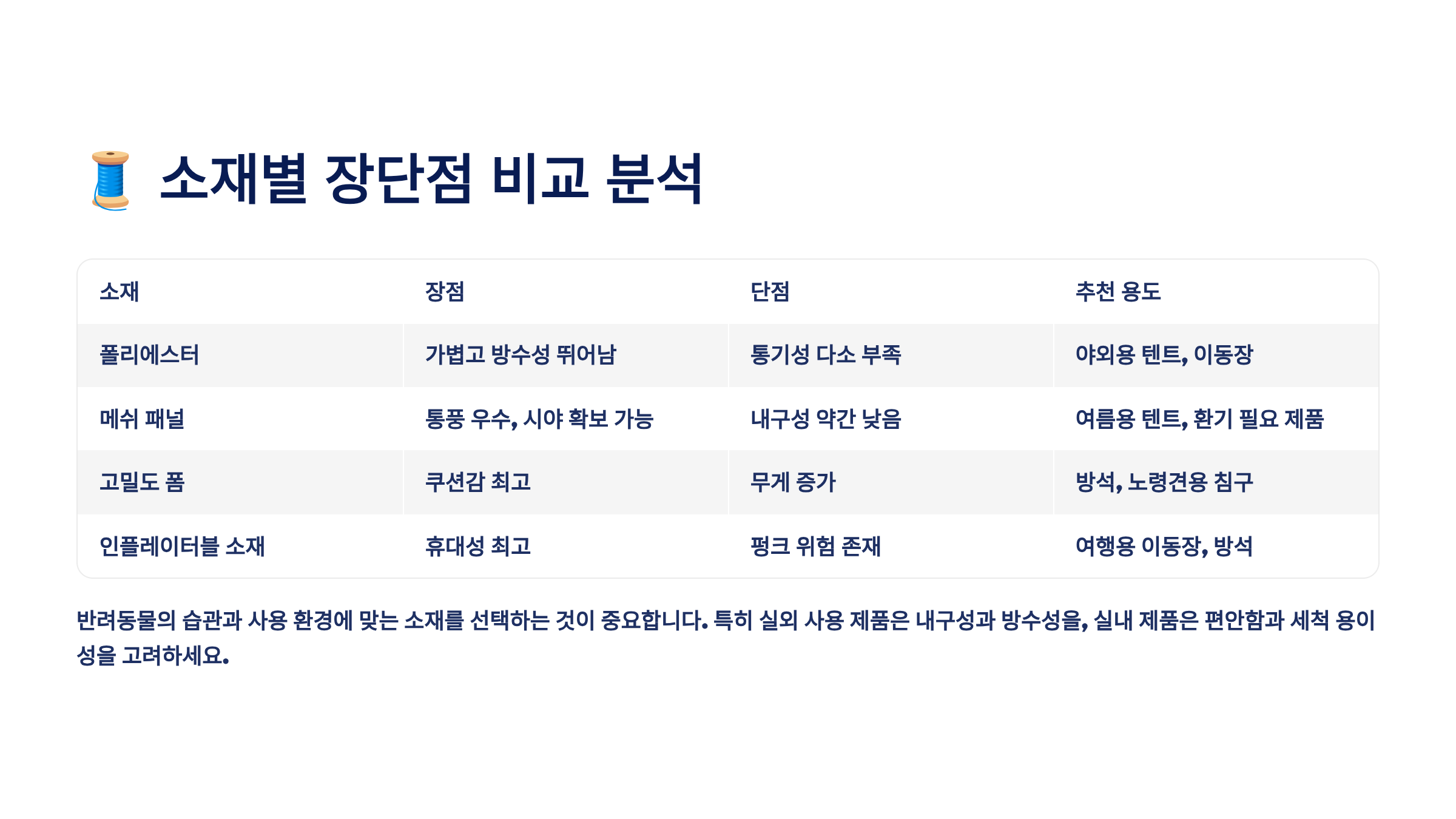 소재 선택 시 반려동물의 특성을 고려해야 해요. 털이 많이 빠지는 아이라면 털이 잘 달라붙지 않는 소재를, 피부가 예민한 아이라면 저자극 천연 소재를 선택하세요. 활동량이 많은 아이는 내구성이 강한 소재가 좋고, 노령 반려동물은 부드러운 소재가 적합해요.