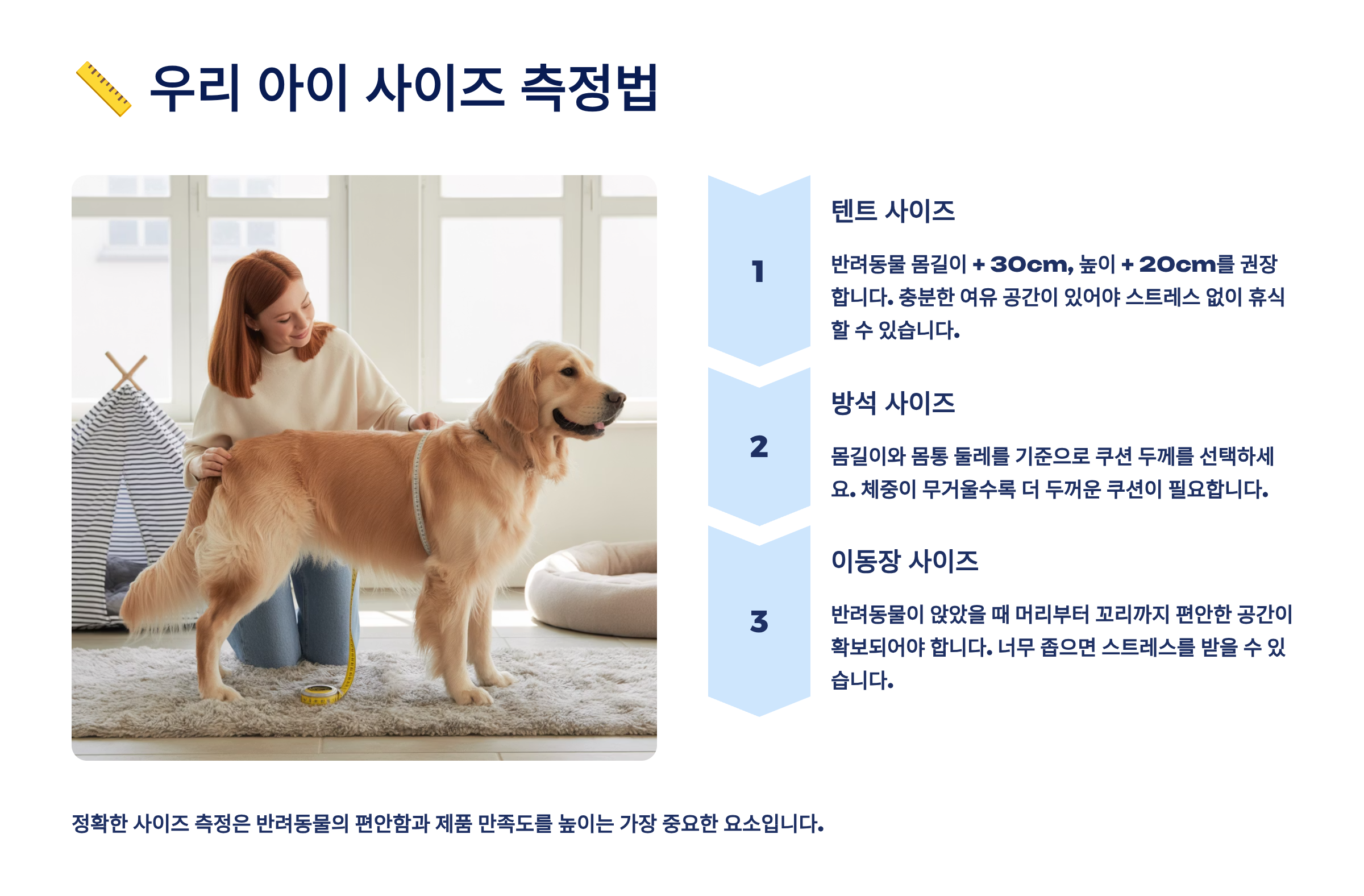 사이즈 선택은 반려동물이 완전히 누웠을 때 발끝까지 다 올라갈 수 있는 크기가 좋아요. 너무 작으면 불편하고, 너무 크면 아늑함이 떨어져요. 다견 가정이라면 각자의 방석을 준비해주는 게 영역 다툼을 예방할 수 있어요. 색상은 털 색과 대비되는 걸 선택하면 털 관리가 쉬워요! 🎨