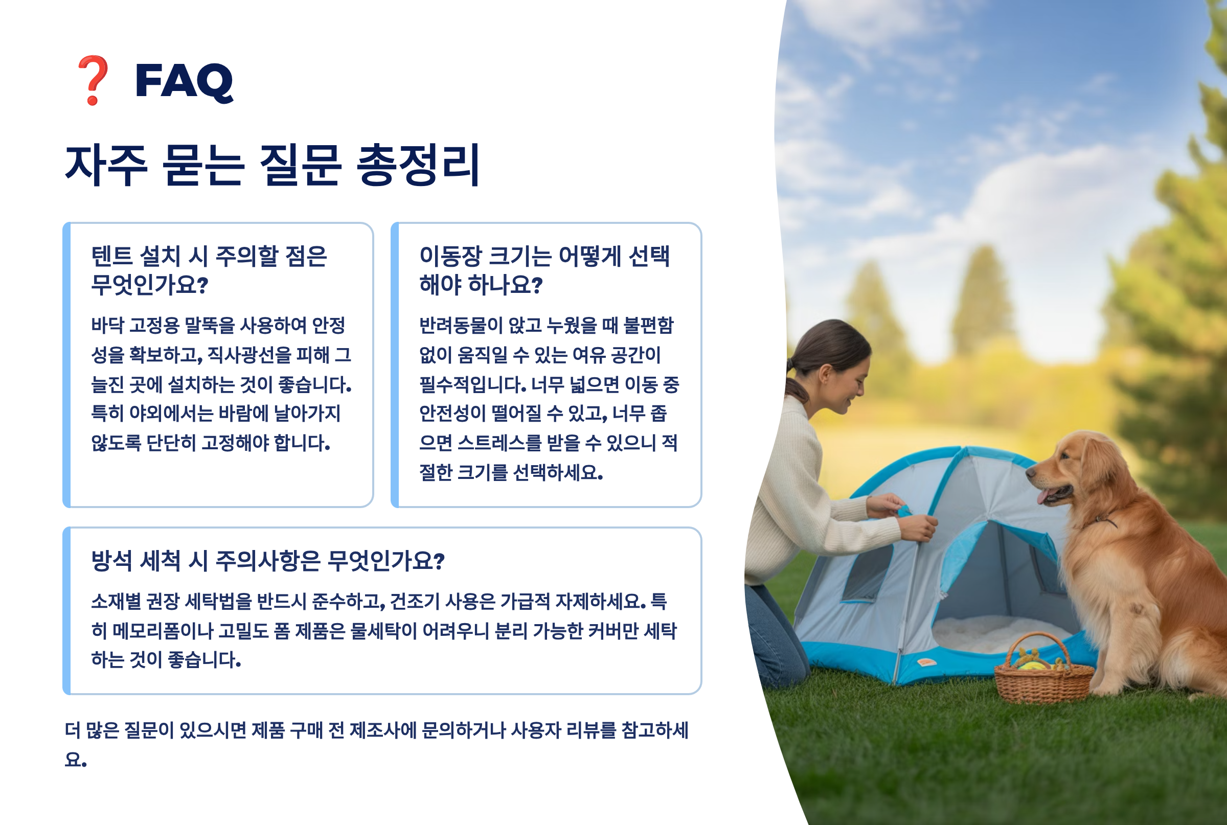 지금까지 펫 전용 텐트, 방석, 이동장에 대한 모든 정보를 상세히 알아봤어요. 반려동물과 함께하는 일상이 더욱 행복하고 편안해지길 바라며, 각 제품의 특징과 선택 기준, 관리 방법까지 꼼꼼히 정리해드렸답니다. 우리 아이에게 맞는 최적의 제품을 선택하는 데 도움이 되었길 바라요.