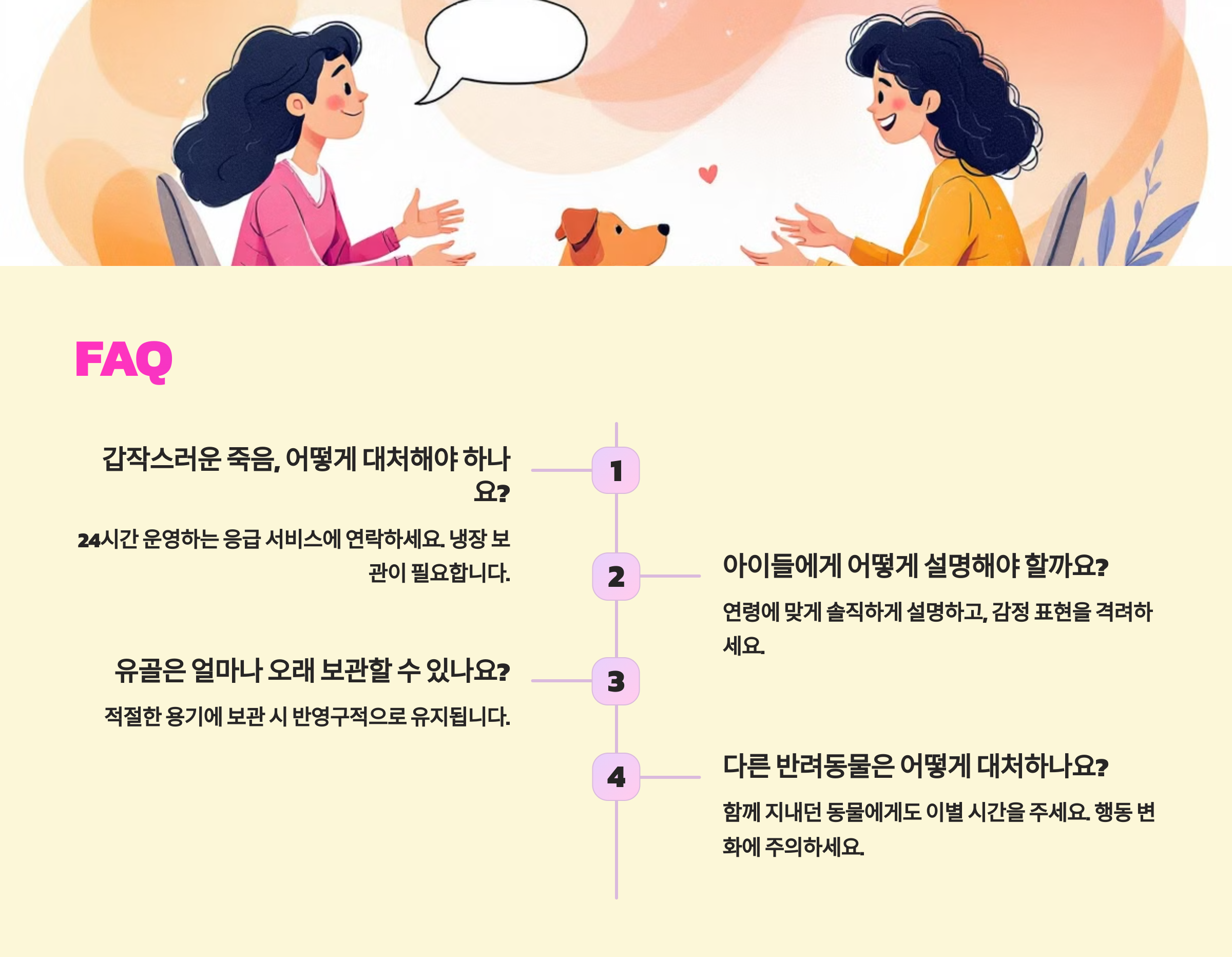 A8. 일부 장례식장에서는 반려인 슬픔 상담(펫로스 세션)을 운영해요. 필요하다면 꼭 문의해보세요. 정말 큰 도움이 되기도 해요 🫶