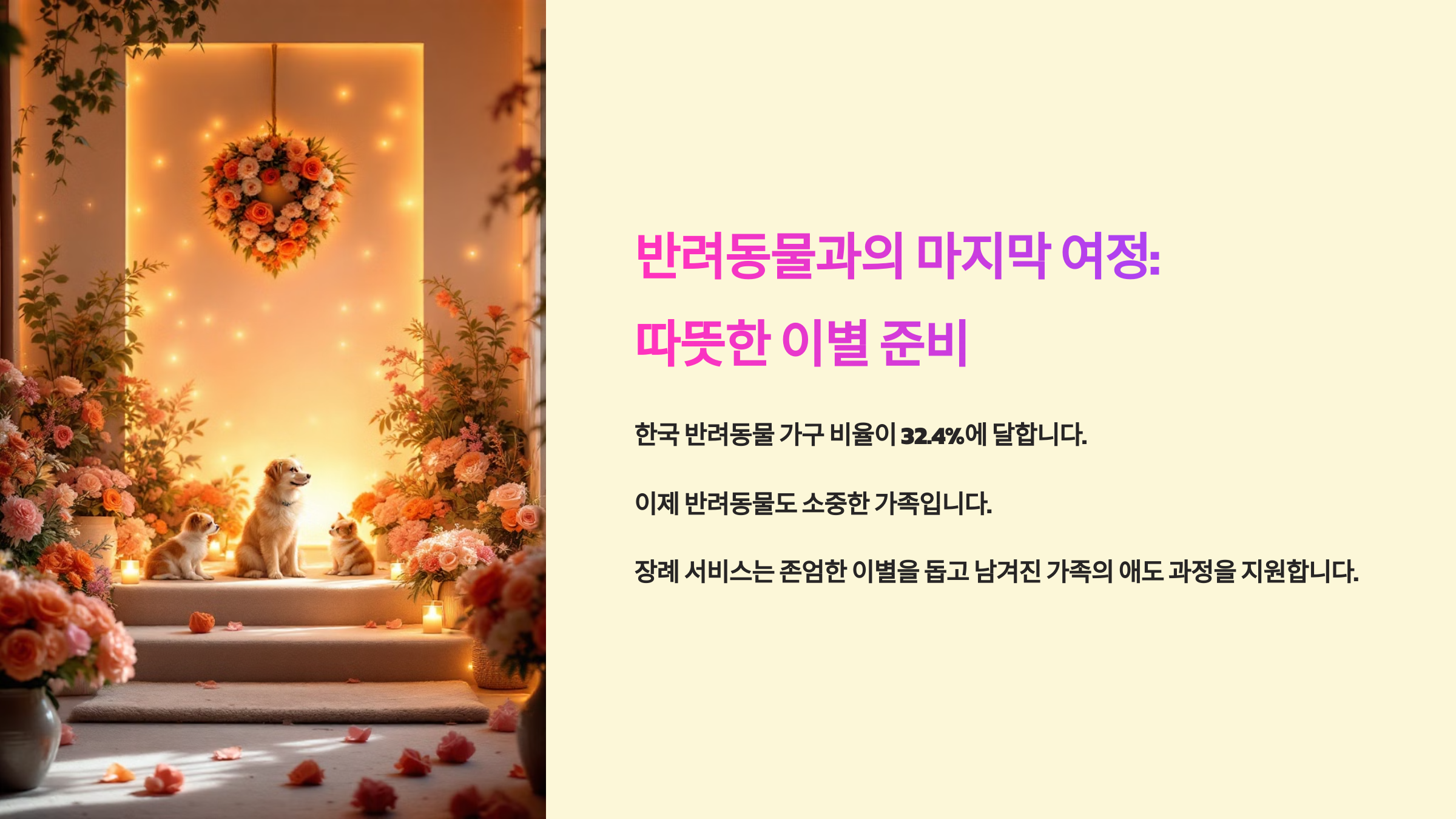 🐶 반려동물은 단순한 동물이 아니에요. 매일을 함께하고, 삶의 순간순간을 공유하며 가족이 된 존재죠. 그래서 이별의 순간도 마땅히 사랑과 존중 속에서 이루어져야 해요.