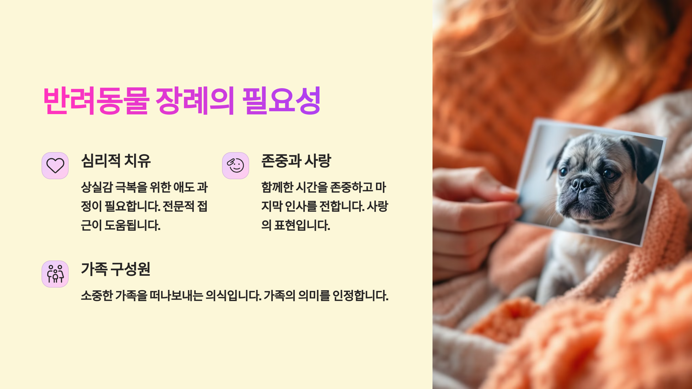 또한, 장례식을 치르면서 아이들에게 생명의 소중함을 자연스럽게 가르칠 수 있어요. 반려동물도 누군가의 가족이었다는 걸 아이들도 함께 배우게 돼요.