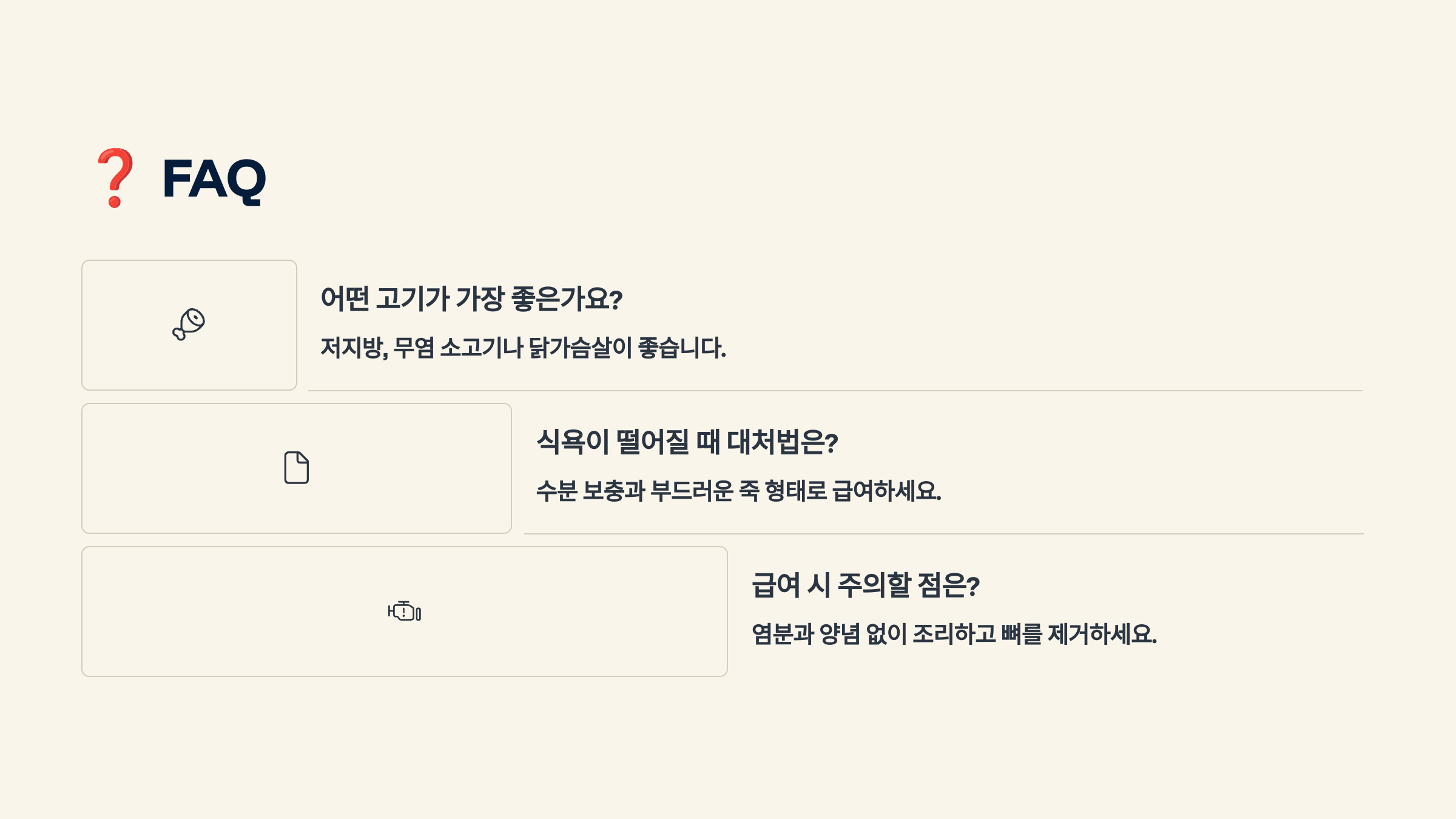 | 소형견 | 닭가슴살, 연어, 계란 | 고단백·소량 고칼로리 |