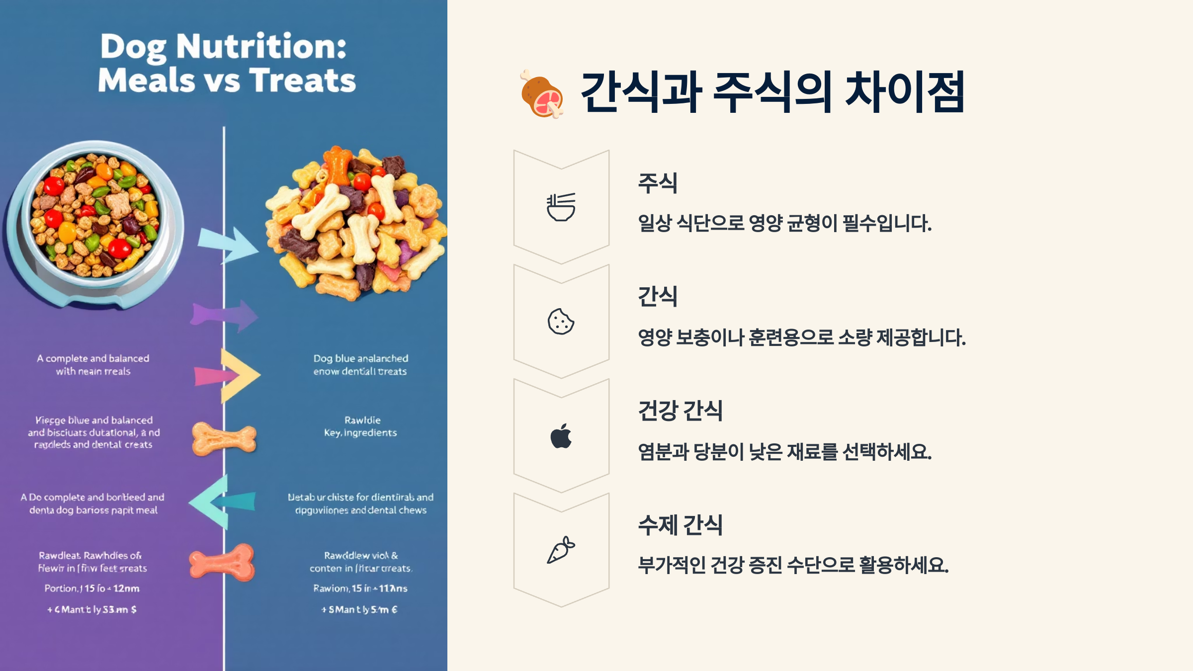 반면 간식은 보상, 칭찬, 간단한 에너지 보충 용도예요. 간식만으로는 하루 영양을 채우기 어려우며, 오히려 지속적인 간식 급여는 비만이나 영양 불균형을 초래할 수 있어요. 특히 단백질보다 탄수화물이 높은 간식은 자칫 주식처럼 착각하기 쉬워요.