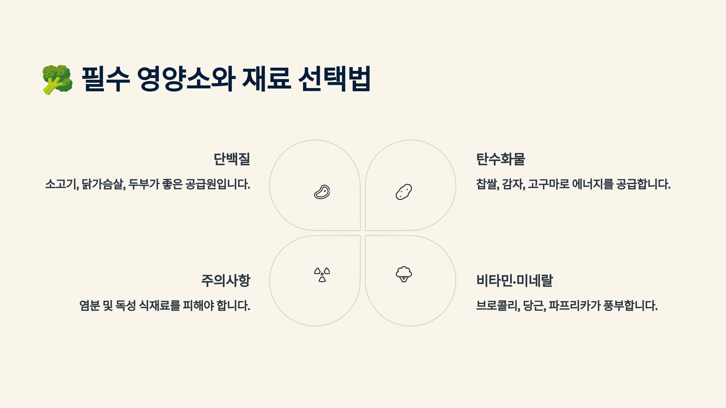강아지의 건강을 유지하고, 성장과 활동에 필요한 에너지를 공급하려면 다양한 영양소를 고루 섭취해야 해요. 사람과는 다르게 단백질, 지방, 탄수화물의 비율과 흡수 방식이 다르기 때문에, 영양식 제작 시 기본 구성과 균형이 핵심이에요. 특히 수제식을 급여할 경우 영양의 불균형이 생기지 않도록 주의해야 해요.