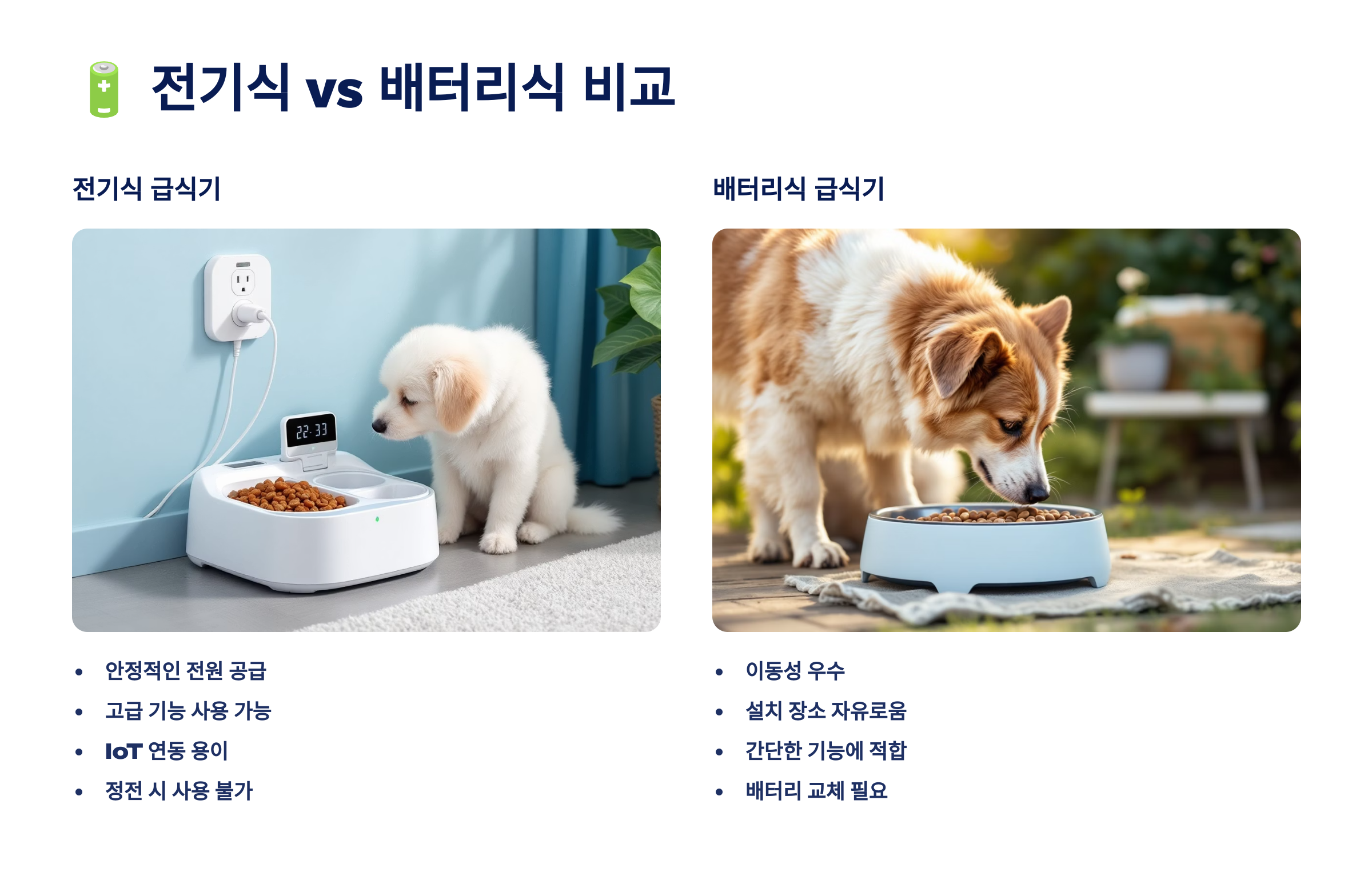 📍 그런데 단점도 있죠. 배터리식은 기능이 간소한 경우가 많고, 배터리 교체 비용도 들 수 있어요. 급여 시간 설정은 가능하지만 앱 연동, 카메라 등은 지원하지 않는 경우가 대부분이에요.