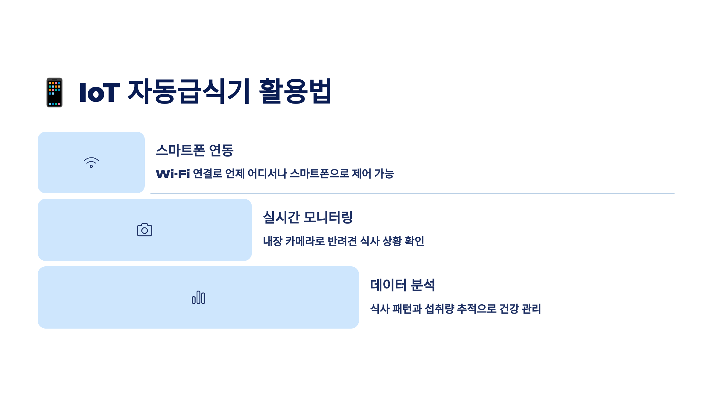 📲 IoT 자동급식기는 단순한 타이머 기능을 넘어서 실시간 제어와 관리가 가능한 스마트 기기예요. 와이파이만 연결돼 있다면 언제 어디서든 반려견의 식사 상황을 확인하고 조정할 수 있어요.