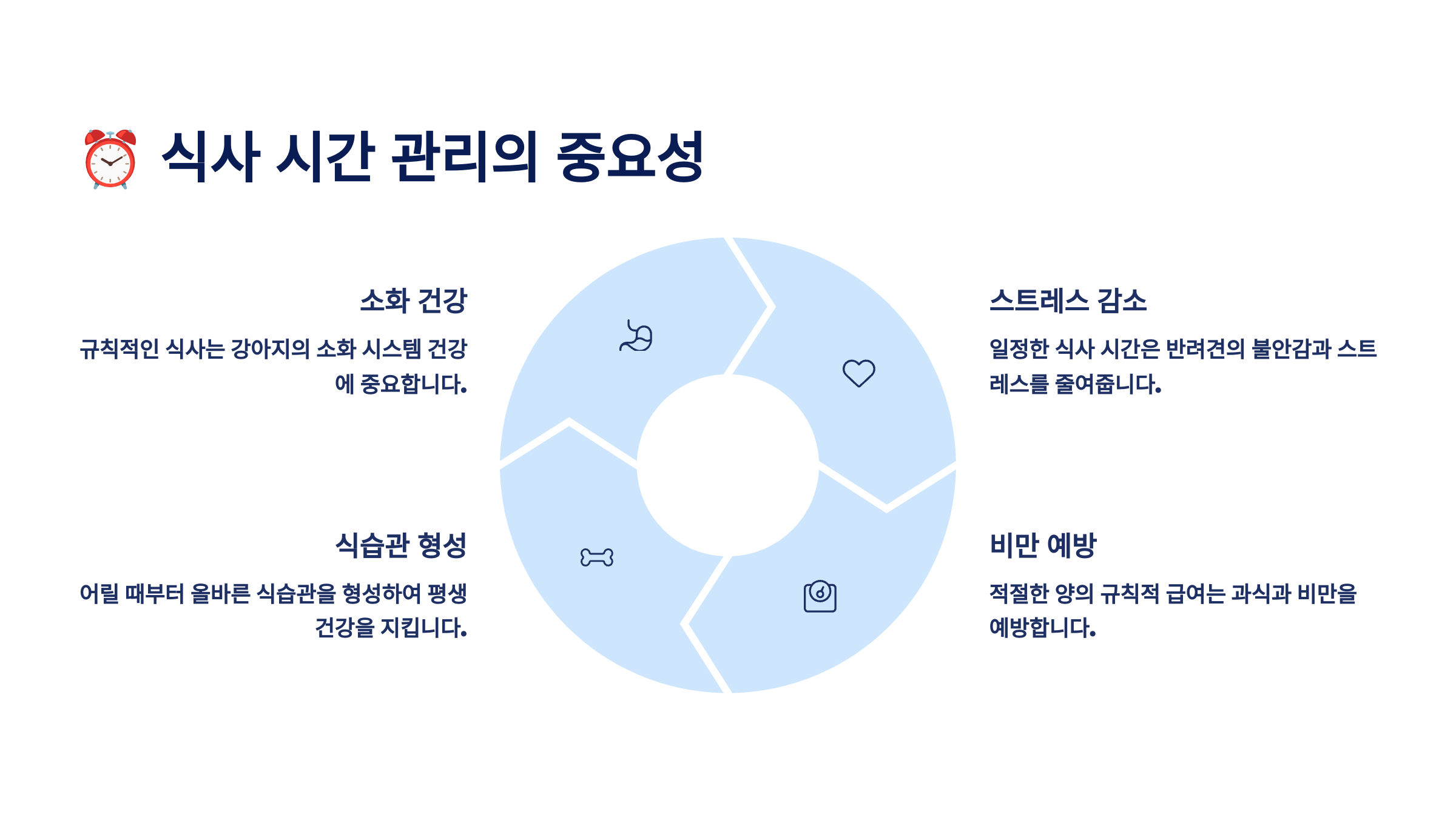 ⏱ 강아지에게 가장 중요한 생활 습관 중 하나는 정해진 시간에 식사하기예요. 사람처럼 "배고프면 알아서 먹지"라는 개념이 통하지 않아요. 규칙적인 급여는 건강뿐 아니라 심리적 안정에도 필수예요.