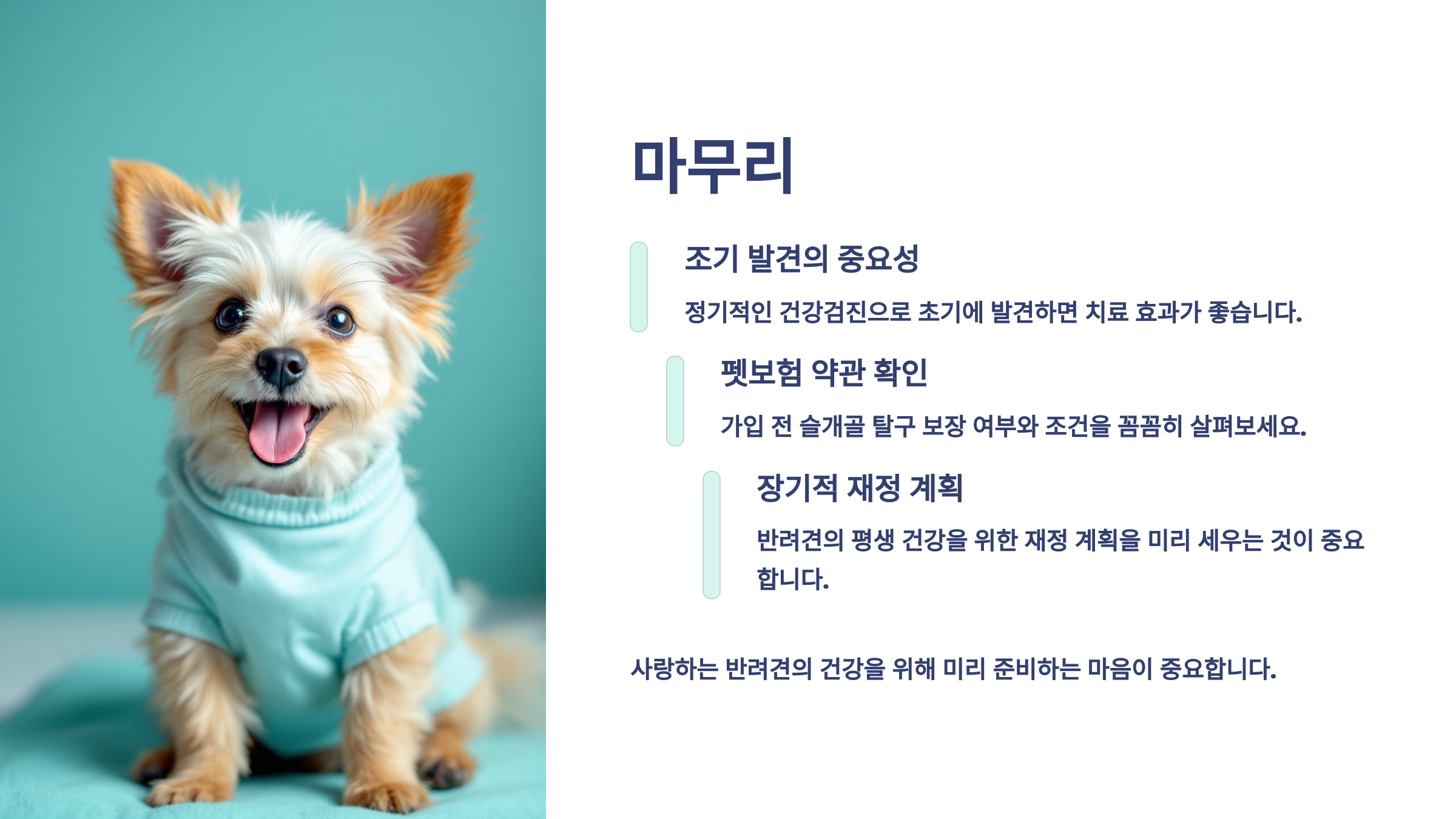 제가 생각했을 때, 슬개골 탈구 같은 질환은 ‘혹시’가 아니라 ‘언제’ 일어날 수 있는 문제라서, 미리 보험으로 대비해두는 게 우리 반려견을 위한 최고의 선물이라고 느껴졌어요.