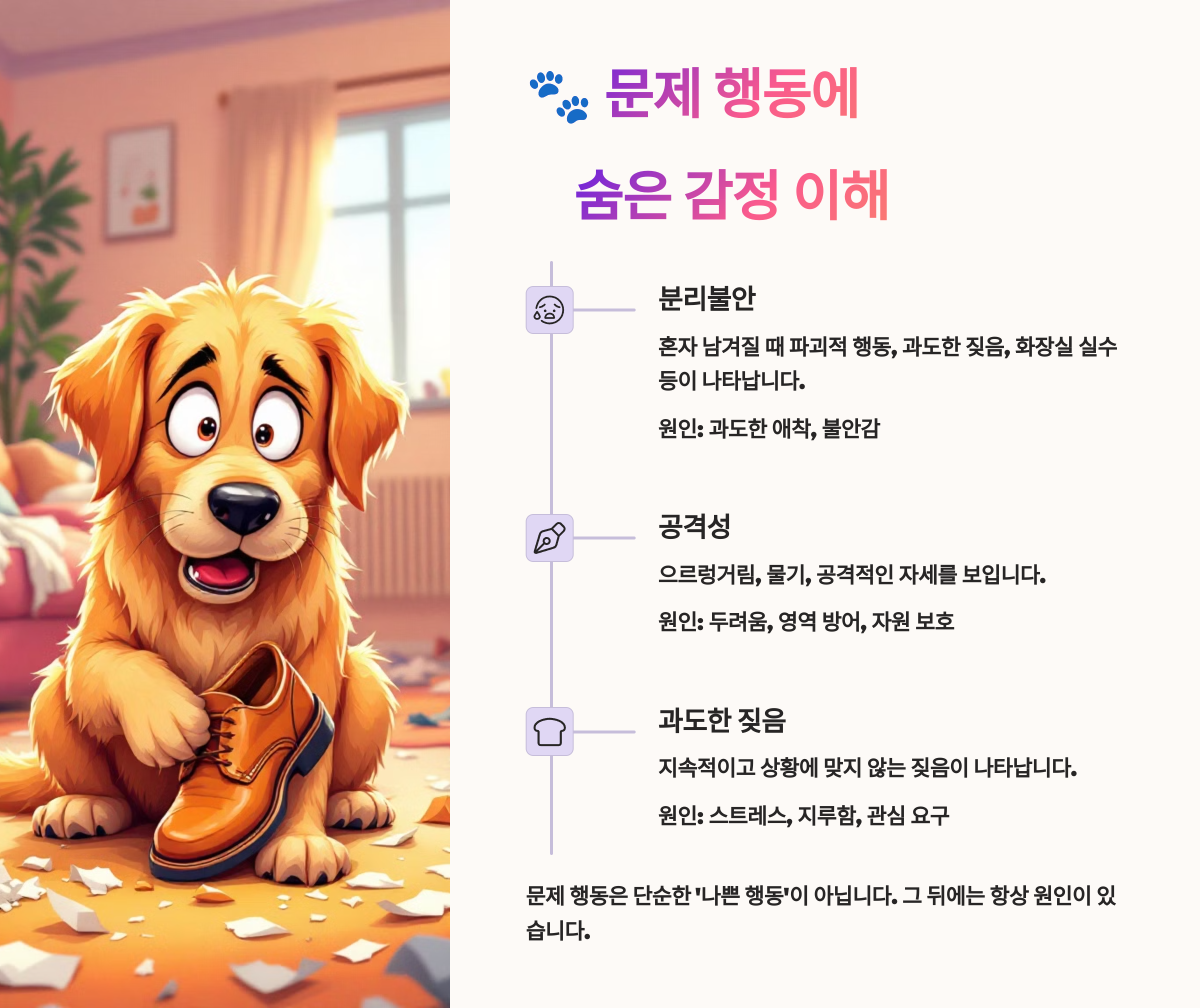 🐾 갑자기 짖기, 소변 실수, 물건 물어뜯기 같은 문제 행동은 대부분 감정적 원인을 가지고 있어요. 주의 끌기, 분리불안, 지루함이 대표적인 이유죠.