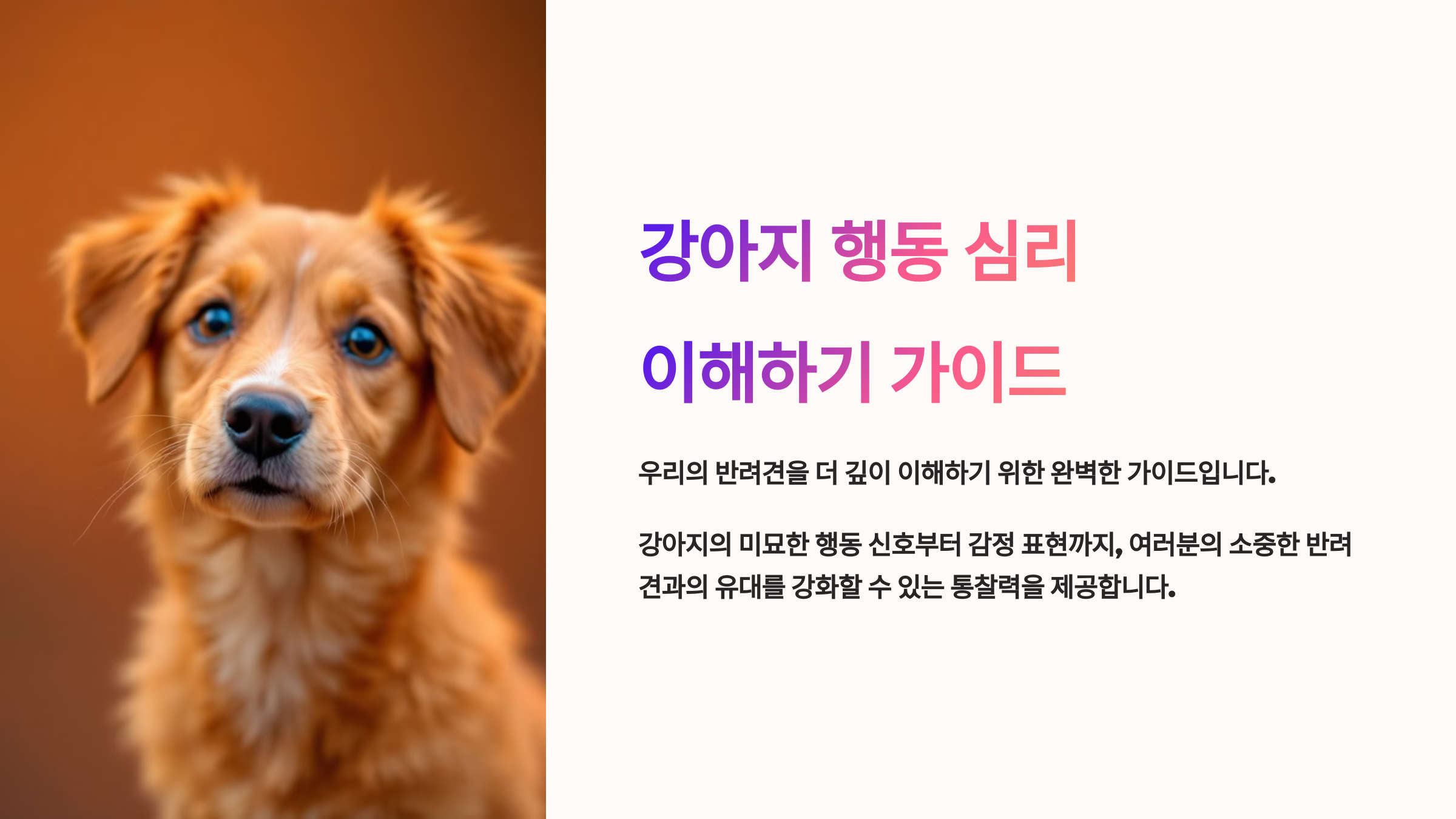 🧠 심리를 이해하면 문제 행동도 줄고, 교감도 훨씬 깊어져요. 강아지가 먼저 다가오는 보호자가 되기 위해선, 우리가 먼저 마음을 열어야 해요.