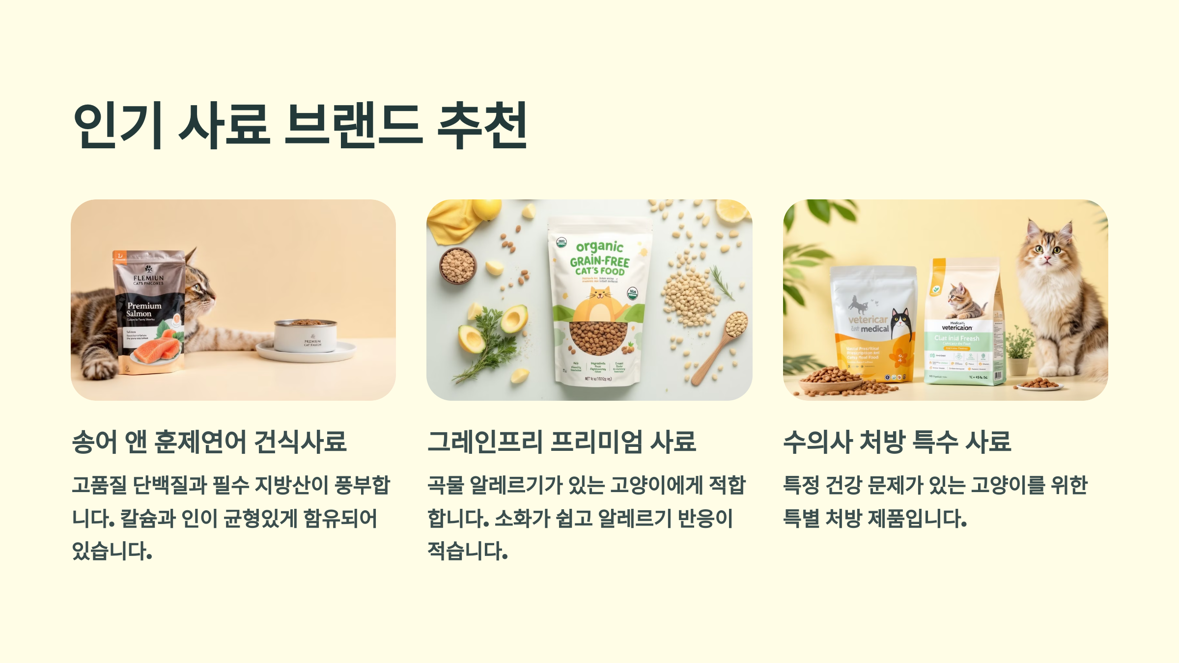 😽 수많은 사료 브랜드 중에서도 리뷰 수 많고, 재구매율 높고, 고양이들이 잘 먹는 제품들이 있어요! 고양이의 건강 상태와 라이프스타일에 맞춰 믿고 먹일 수 있는 브랜드 위주로 소개해드릴게요! 😻