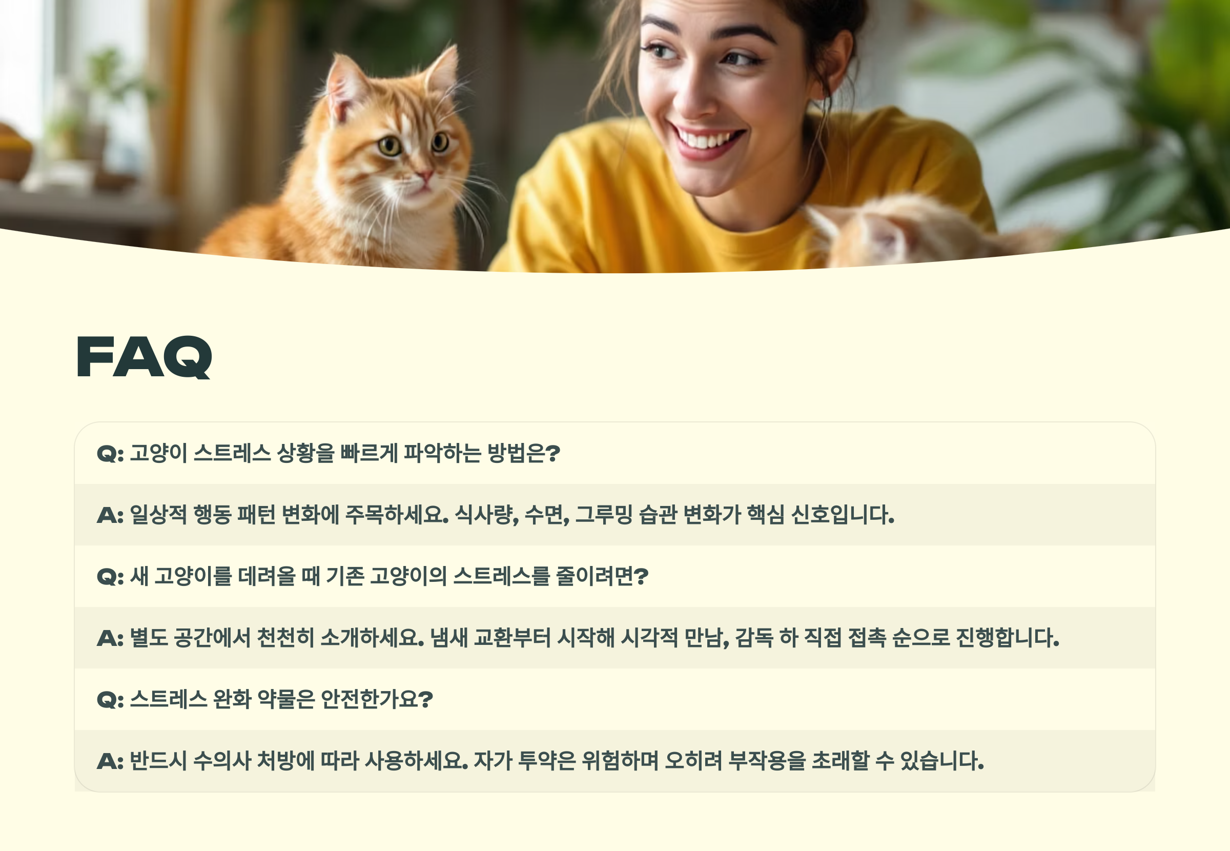 | 겁쟁이묘 (예민한 고양이) | 큰 소리, 방문객, 낯선 환경 | 페로몬 스프레이, 쉘터 공간 확보 |